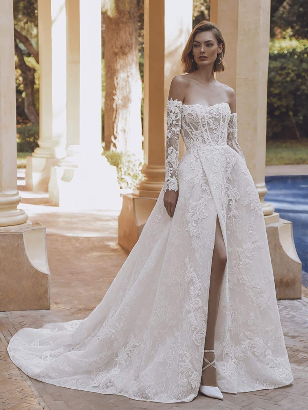 Make a dramatic entrance in UNA, a luxurious ball gown wedding dress featuring cascading layers of sequin corded floral lace and sparkling glitter Chantilly lace. Its off-the-shoulder long sleeves add drama to this regal ensemble, but can be removed to easily transform your look. With a sexy pleated skirt slit, this gown creates a dramatic silhouette fit for a princess bride, ensuring all eyes are on you as you step into your happily ever after.