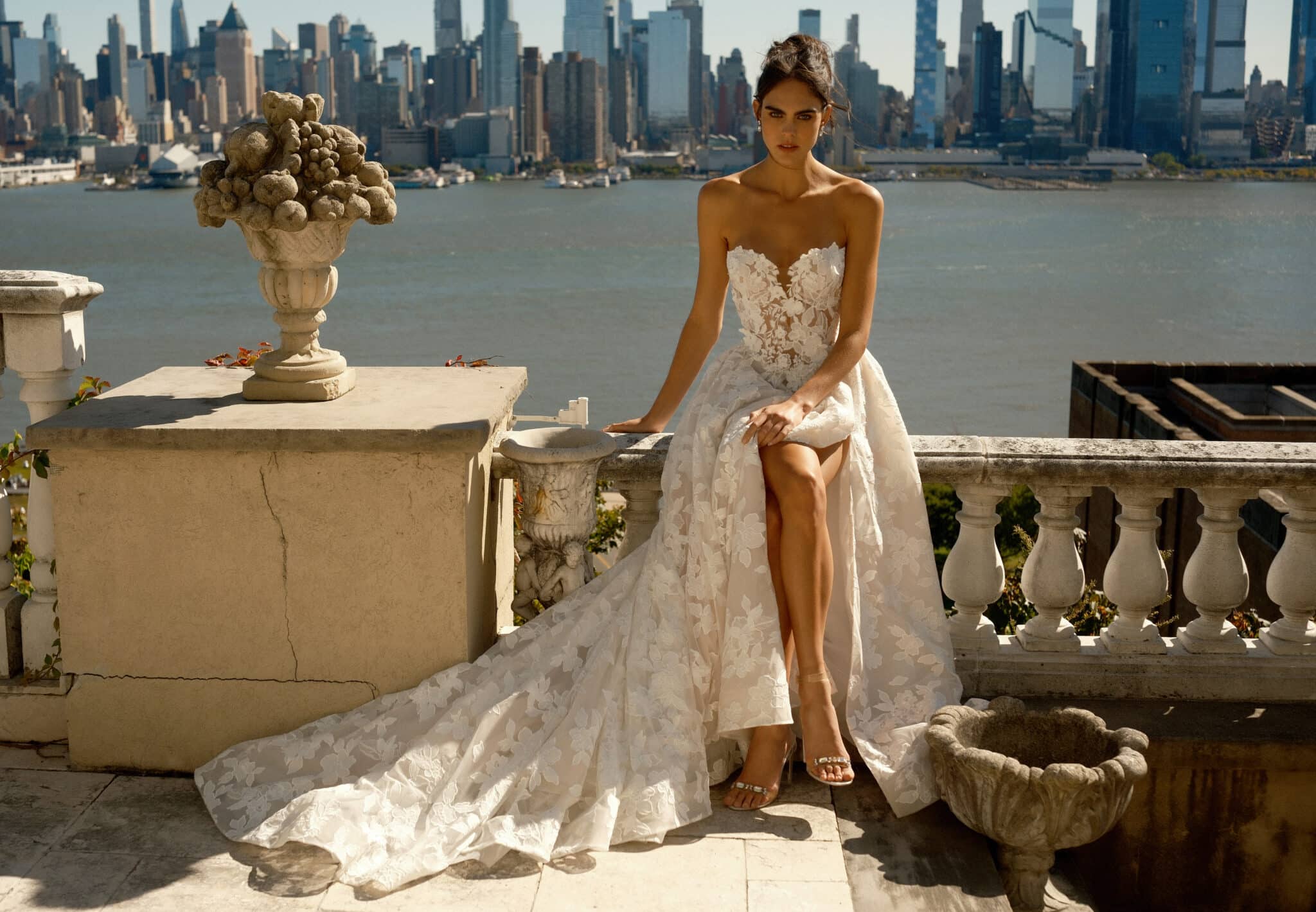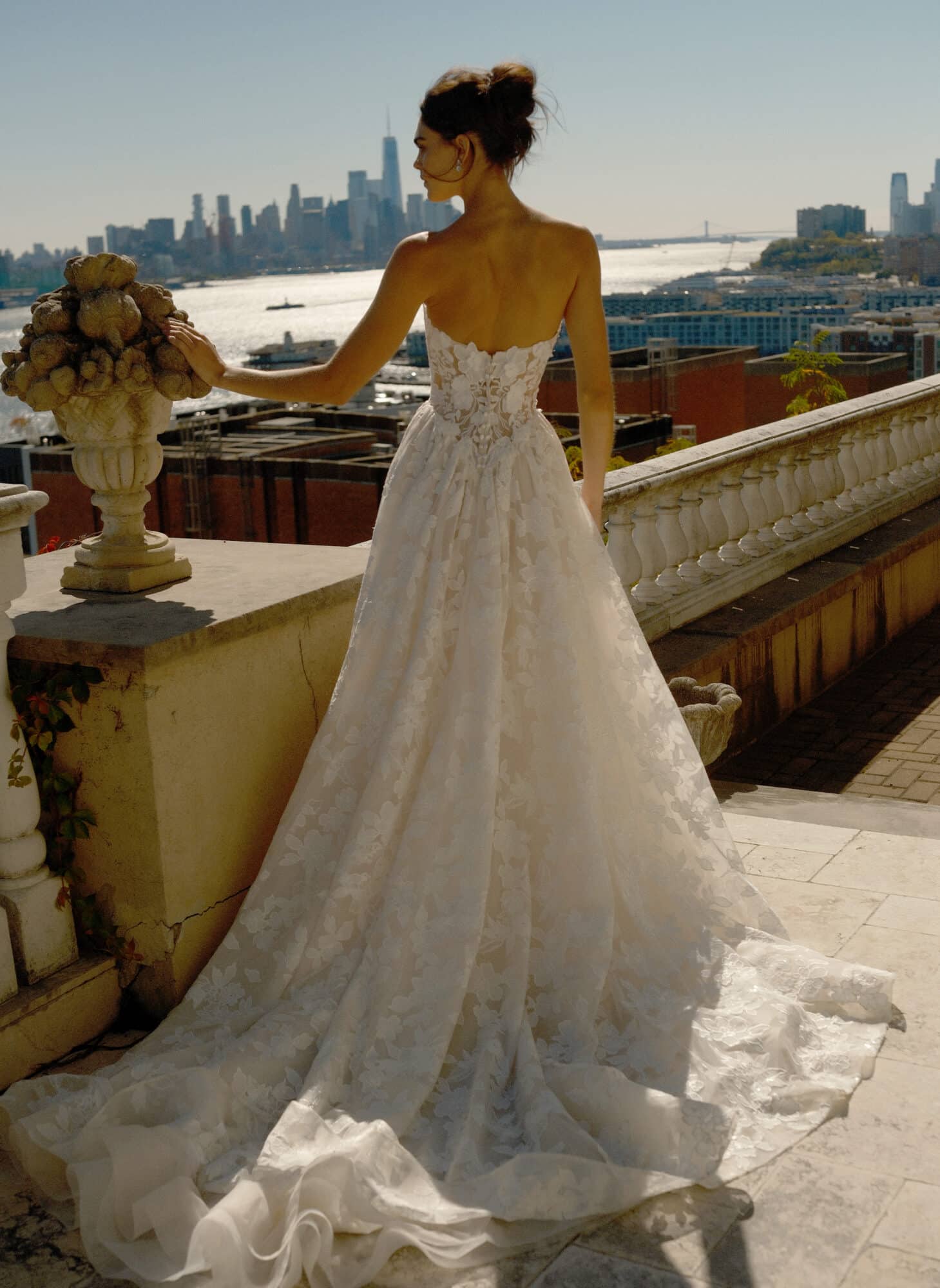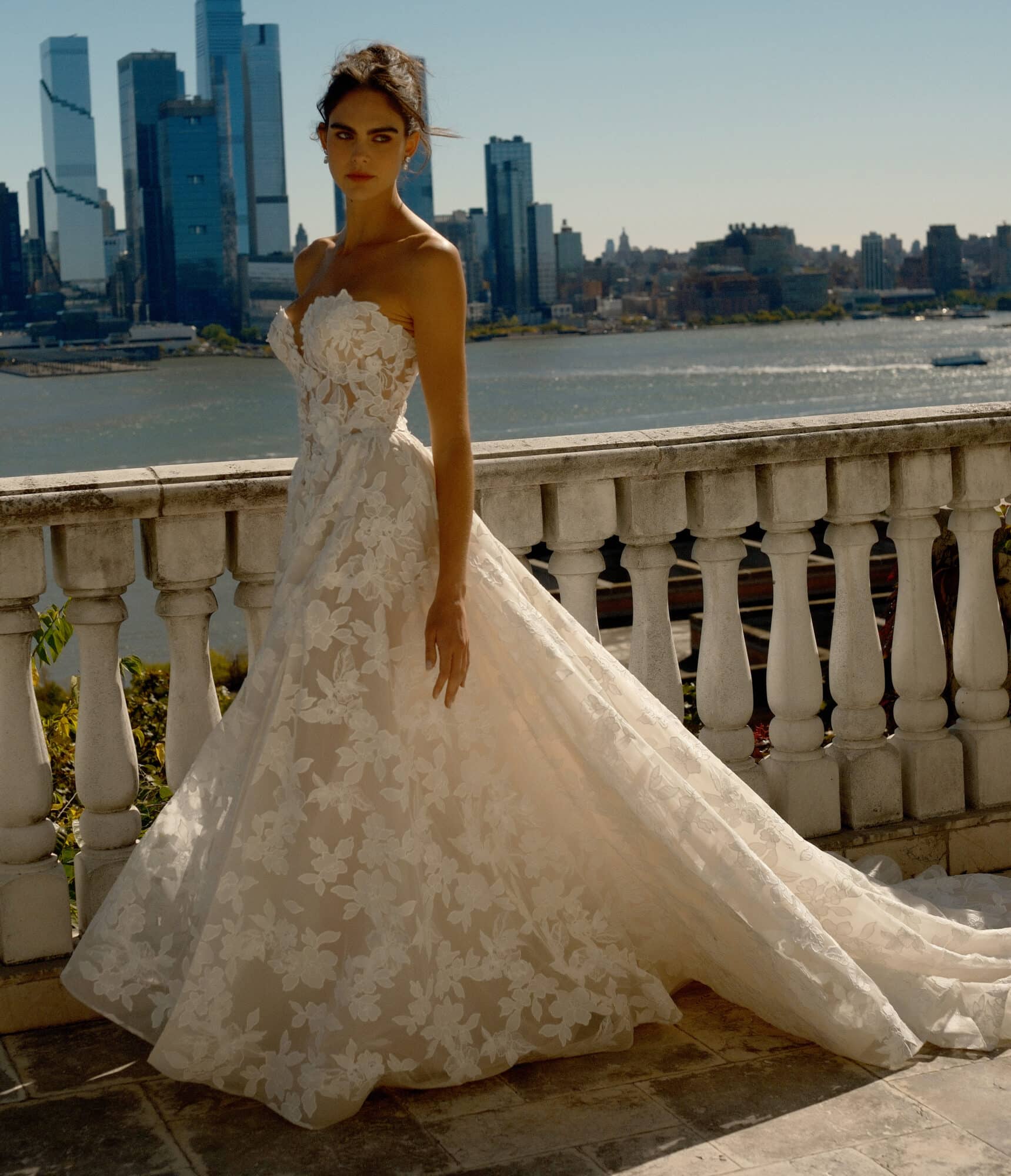 Diamond White and Blush tones come together in this gown featuring an illusion bodice with a soft lace pattern and scattered appliqué, a sweetheart neckline, and a flattering basque waistline that flows into a classic ballgown skirt with a chapel-length train.