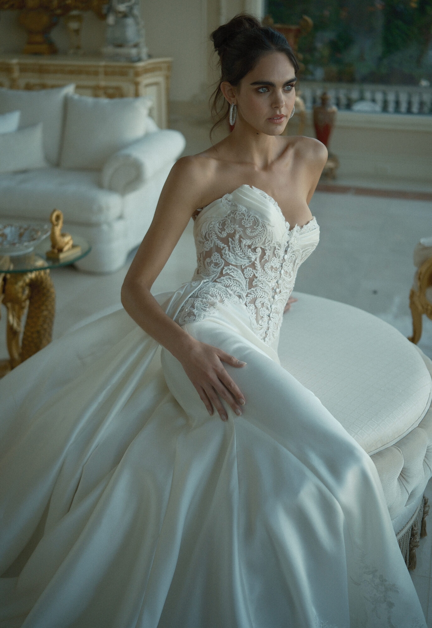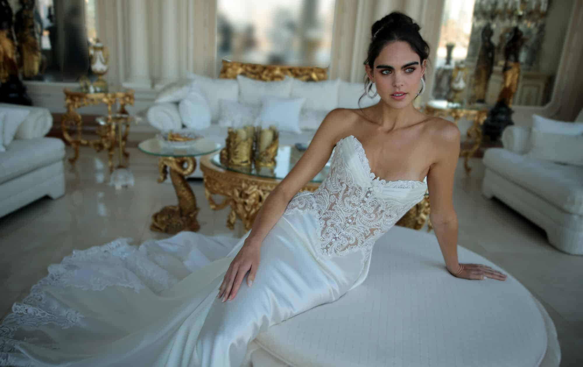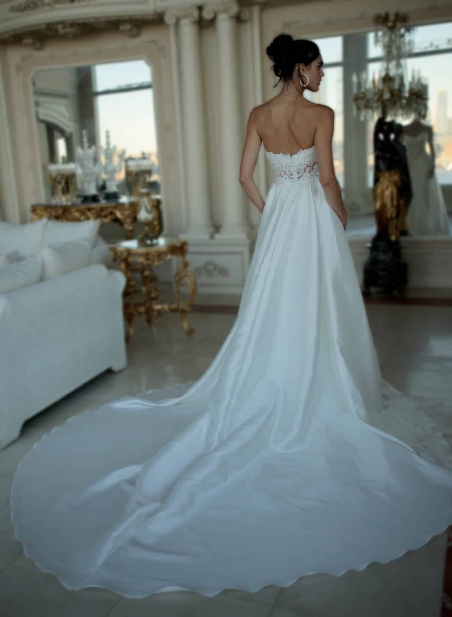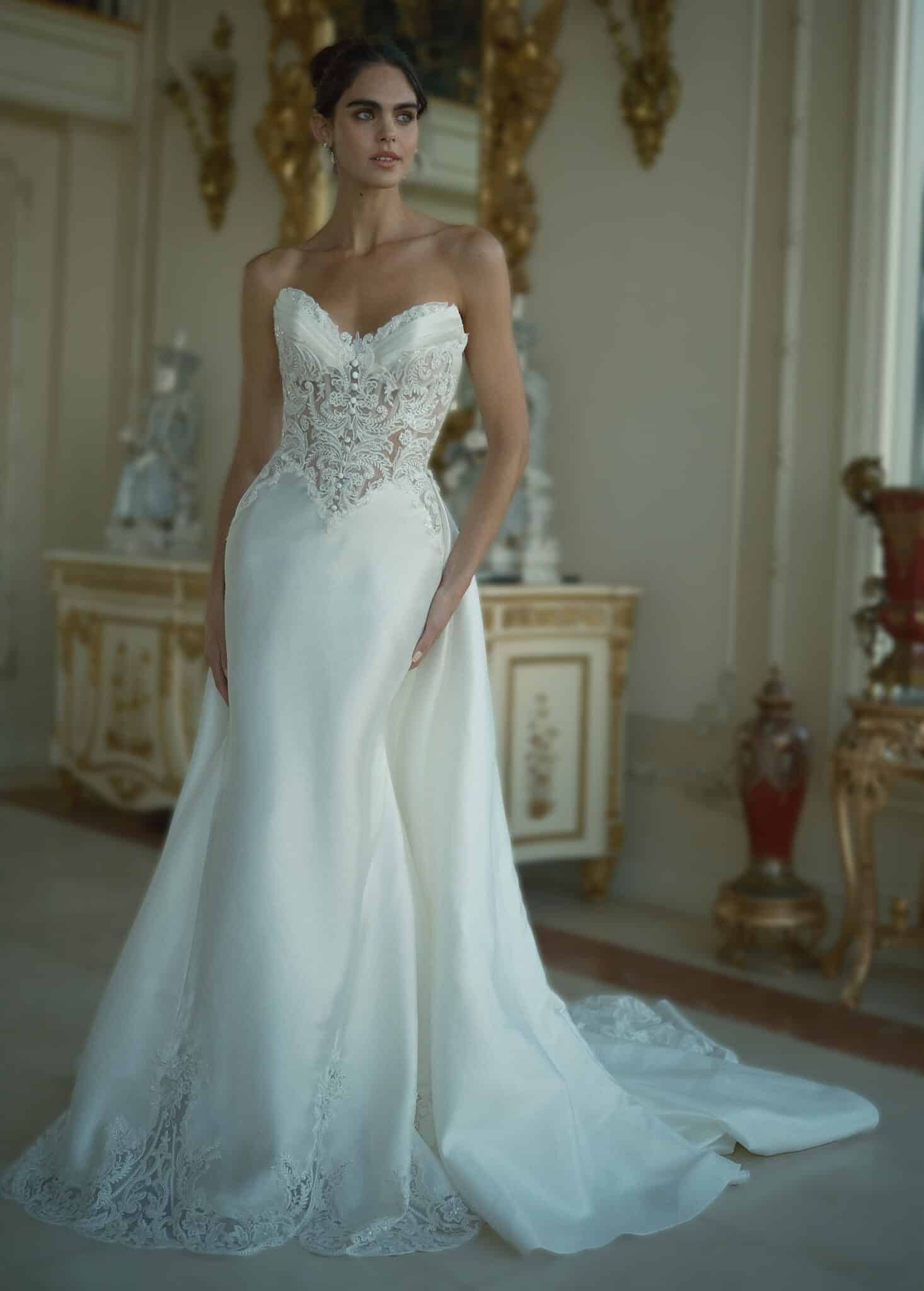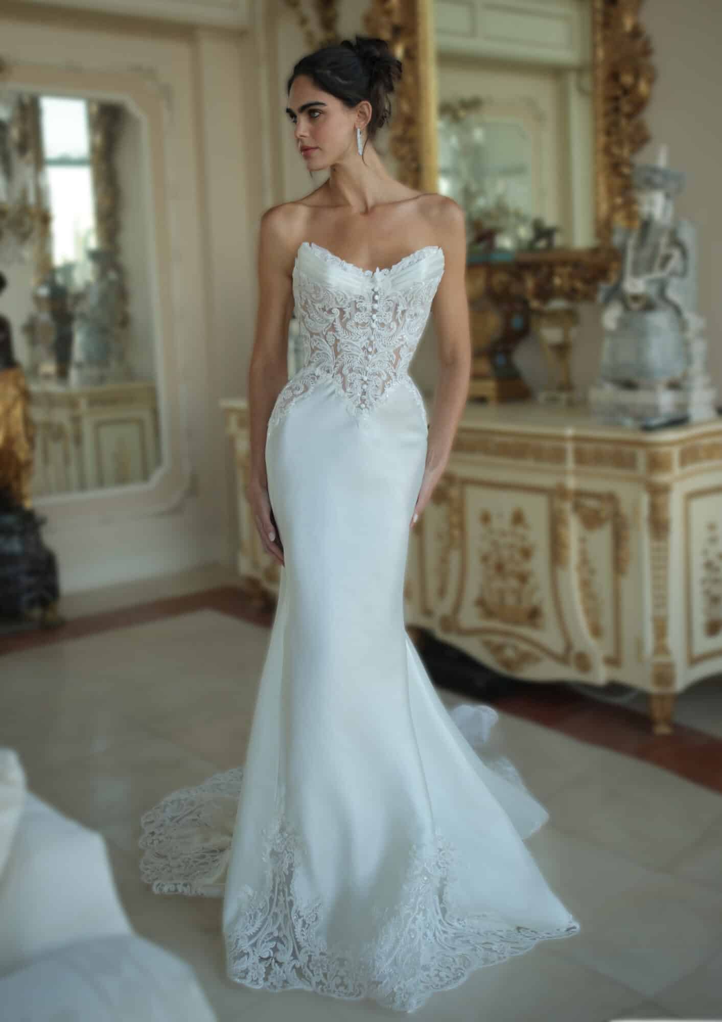 Crafted from Diamond White silk Mikado, this gown features an un-beaded lace bodice accented with silk satin and delicate button details, complemented by lace appliqué at the hem of the train, subtle button accents throughout, and a removable train for versatile styling.