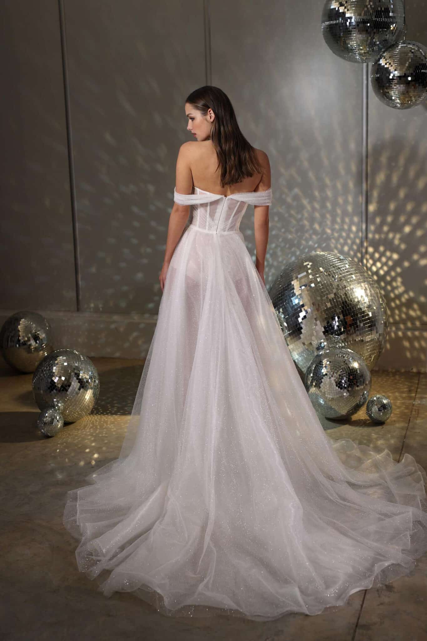 A sheer corset and delicately draped bodice give this natural-waist sparkle tulle ballgown some structure while a feminine tulle bow, off-the-shoulder straps, and a thigh-high slit in the full skirt bring Glow to life in a whimsical way.