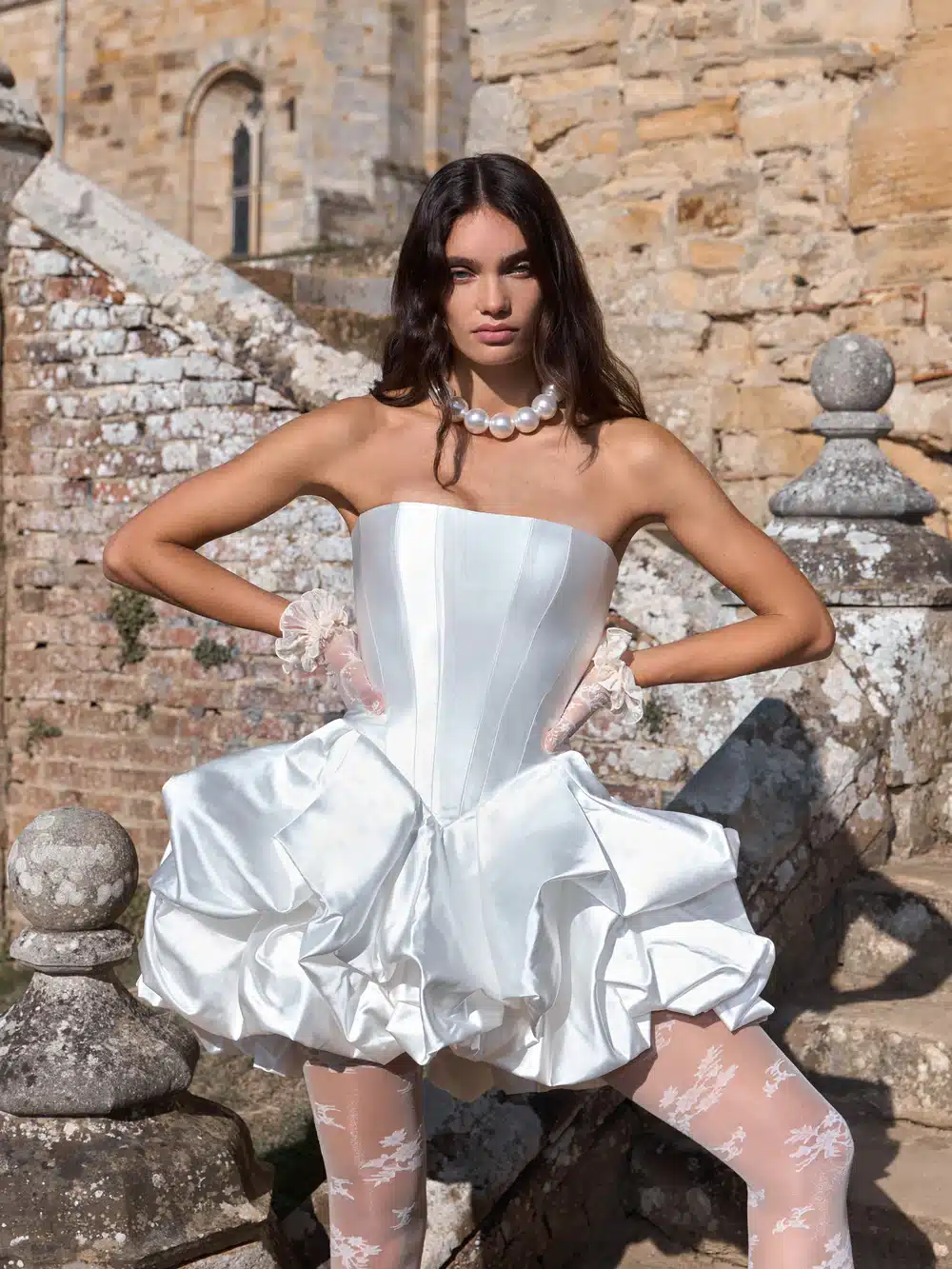 A whimsical mini made of fine silk duchess satin. The corset has a straight-across neckline and sharp basque waist, leading into a super-full bubbled skirt that feels fun and flirty. A delicate lace-up back finishes the look, adding just the right touch of charm.