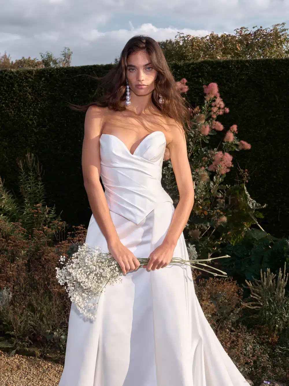A stunning satin creation that combines elegance with a fresh, modern spirit. The corset features a sculpted cat-eye cleavage and a beautifully draped bodice, flowing into a low, architectural waist that emphasizes the silhouette. The skirt is a clever, fashion-forward fusion: a sleek mermaid layer seamlessly merged with a voluminous ball gown, creating a single, unified look that is both chic and on-trend.