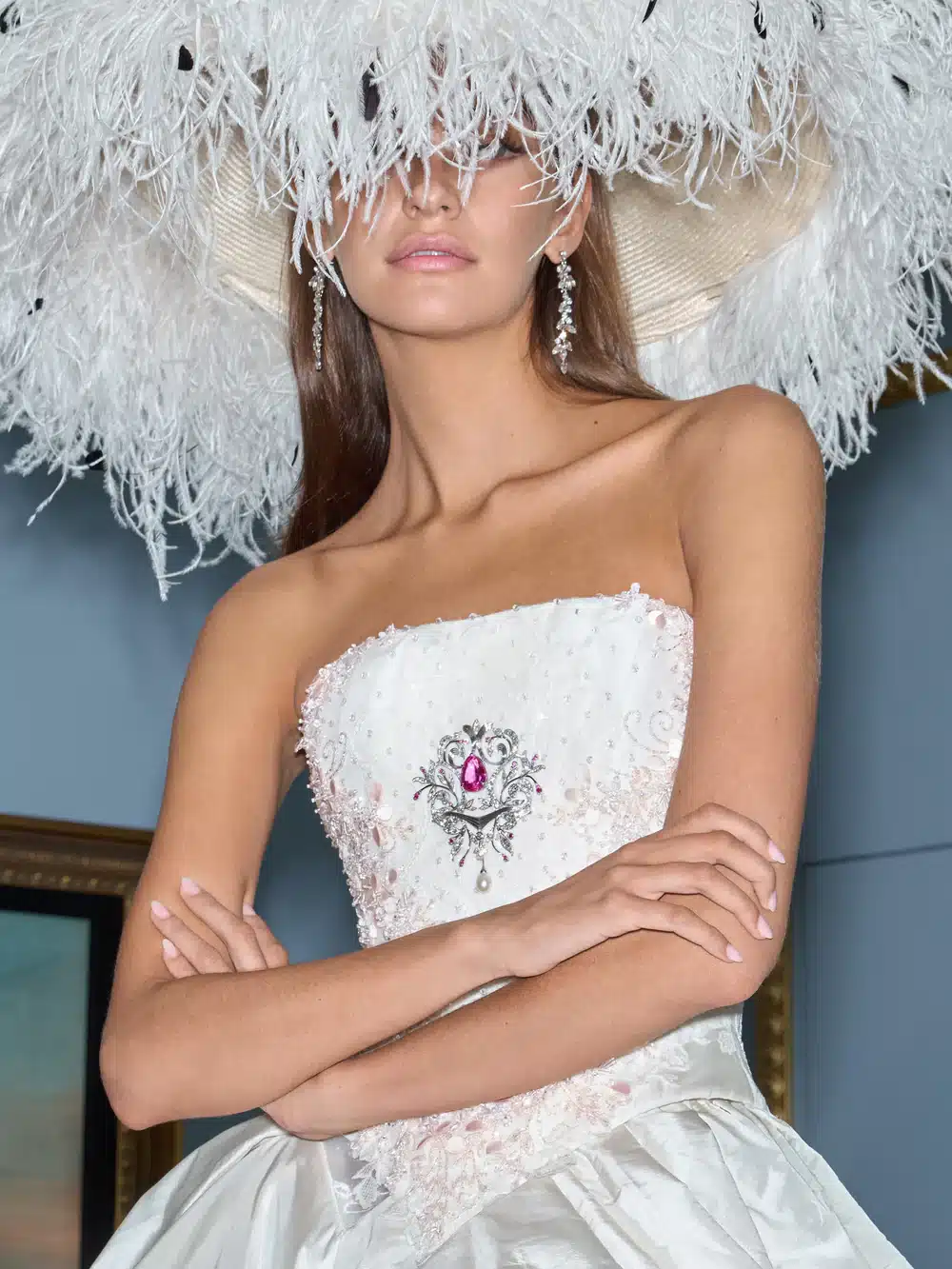 Astor is the undeniable centerpiece of the collection - a ball gown that transcends fashion. Crafted from the finest ivory silk taffetas, the gown begins with a sharply pointed corset and a grand, double-layered skirt. The base skirt, box-pleated and sweeping into a long train, is overlaid with an opulent bubbled train, fastened at the waist and richly trimmed with antique, hand-dyed lace and medallion appliqués. These historic touches evoke the romance and grandeur of the Gilded Age.