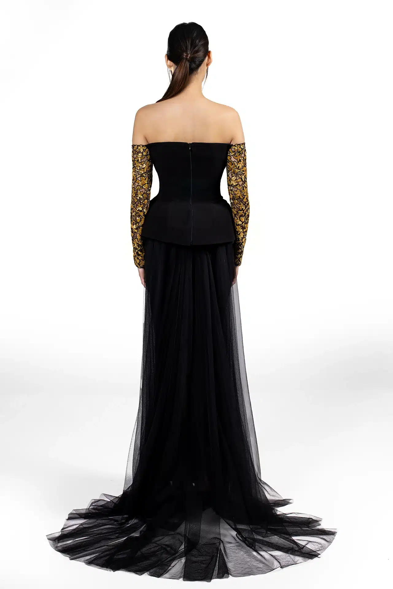 Gattinoli style GA-7444 is a captivating evening gown featuring an off-shoulder neckline with a plunging V-front, a fitted crepe bodice and skirt, and hand-embroidered long sleeves. A sheer tulle overlay skirt with a flowing train adds a touch of ethereal elegance to this sophisticated design.