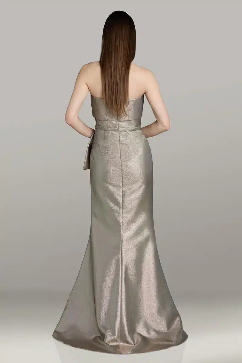 Glamorous and refined, Gia Franco style 12562 is crafted from luminous gold metallic novelty fabric for an elevated, modern look. The strapless cuff neckline creates a clean, sophisticated silhouette, while a self belt with a statement bow elegantly defines the waist. Finished with a flattering fit-and-flare skirt, this gown is a stunning choice for a polished mother of the bride moment.