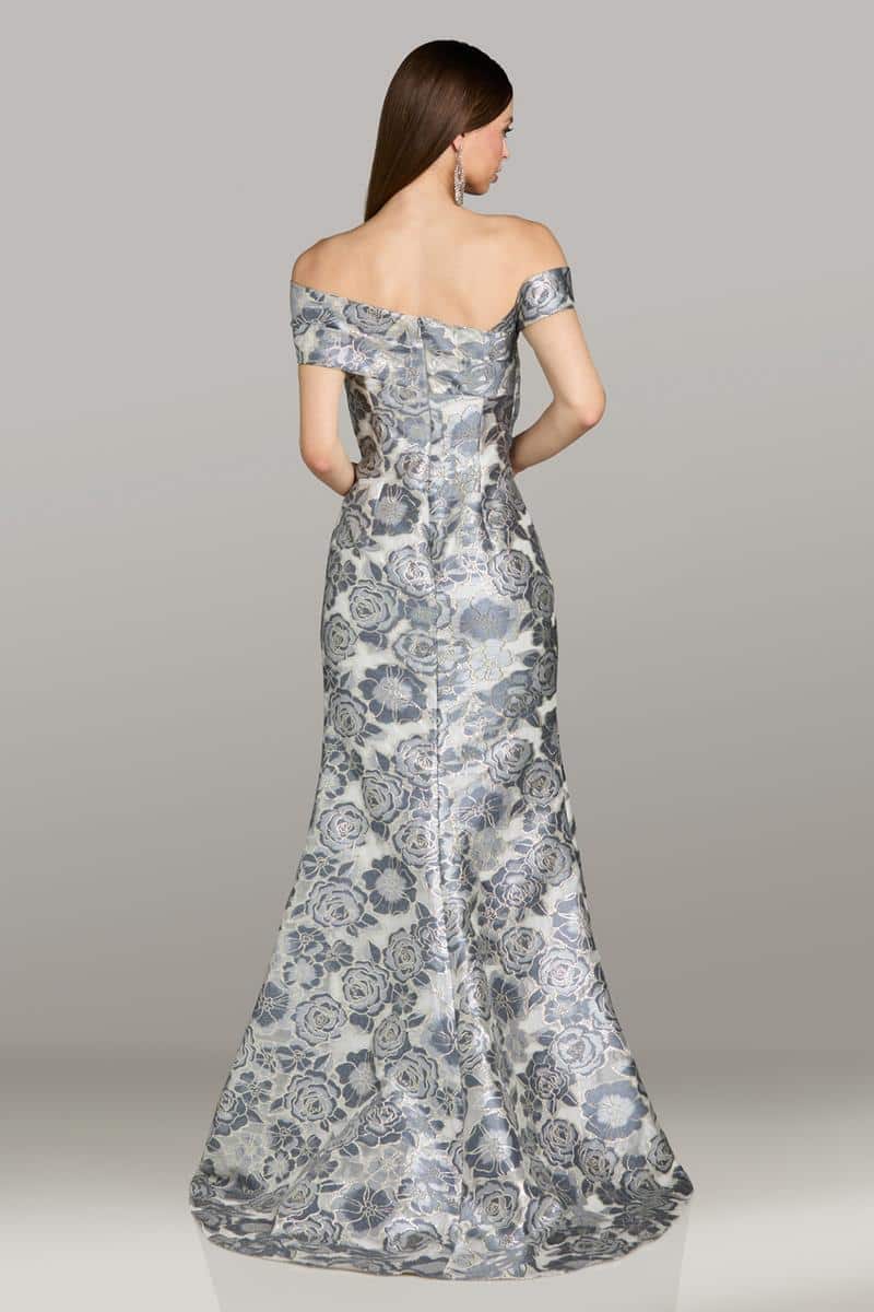 Elegant and eye-catching, Gia Franco style 12588 is crafted from shimmering gold metallic novelty fabric with a romantic floral motif. The off-the-shoulder cuff neckline creates a graceful frame, while a self belt with a delicate bow accentuates the waist. Finished with a flattering fit-and-flare silhouette and a subtle front slit, this gown is a beautiful choice for a sophisticated mother of the bride look.