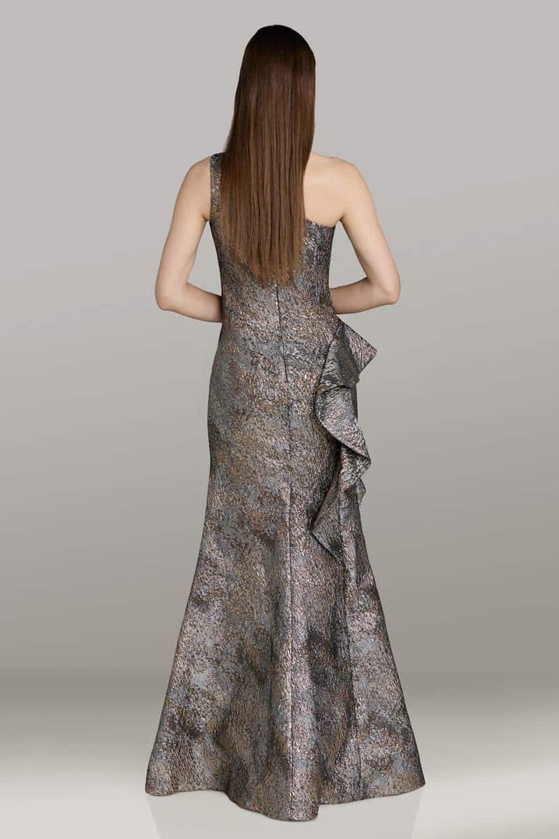 Modern and striking, Gia Franco style 18496 is crafted from a shimmering novelty metallic print for a sophisticated statement. The asymmetrical one-shoulder neckline pairs beautifully with a ruched bodice that enhances the figure, while a cascading side ruffle adds dimension and drama. Finished with a sleek, elongated silhouette, this gown is a stunning choice for a fashion-forward mother of the bride.