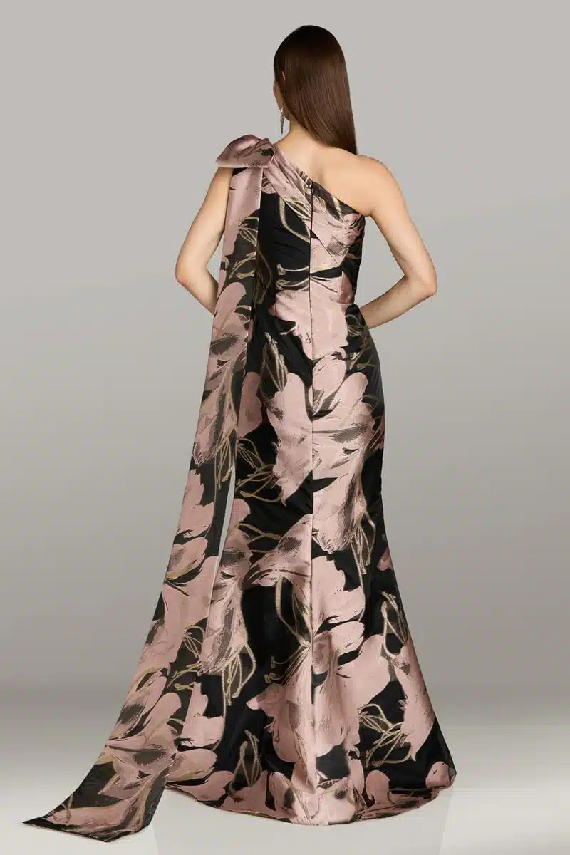 Bold and elegant, Gia Franco style 18560 is crafted from striking black and mauve fabric adorned with an oversized floral print. The asymmetrical one-shoulder neckline is finished with a dramatic bow detail, adding a touch of couture-inspired flair. Designed in a flattering fit-and-flare silhouette with graceful movement, this gown is a beautiful choice for a fashion-forward mother of the bride.