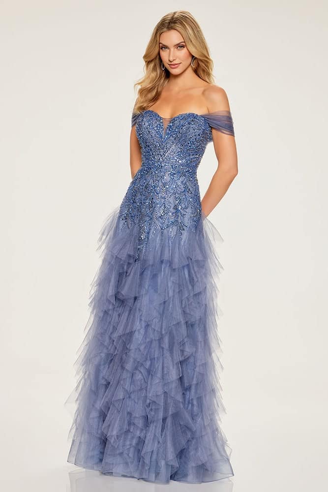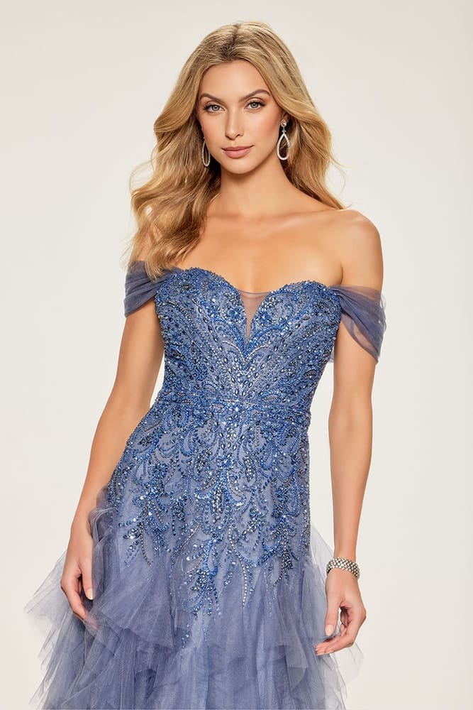 Sweetheart beaded bodice, off shoulder tulle cap sleeves, ruffle tiered skirt.