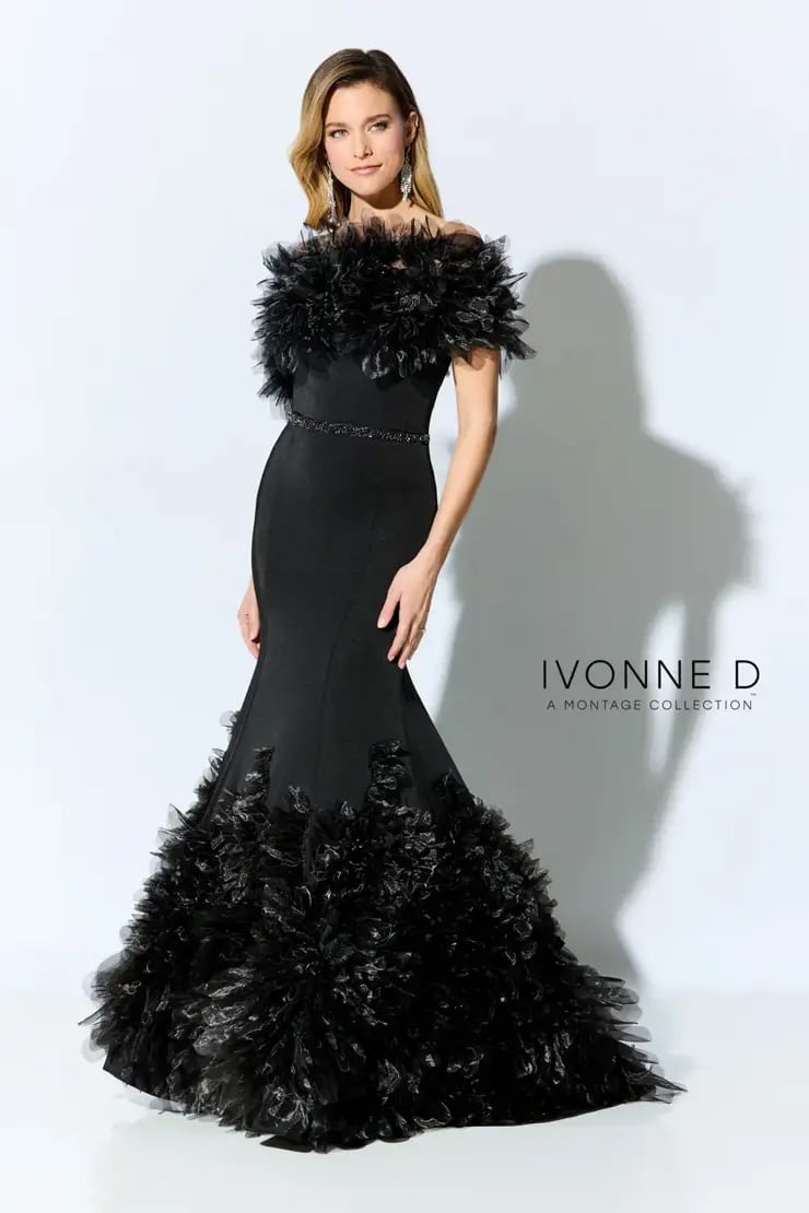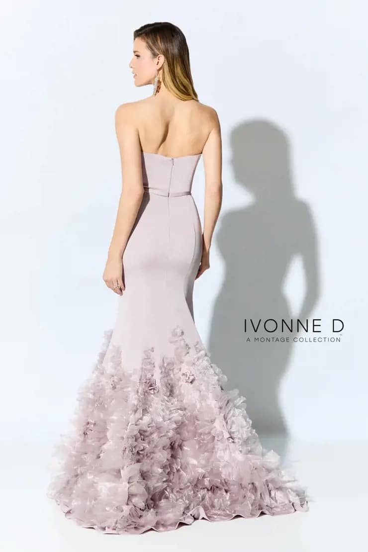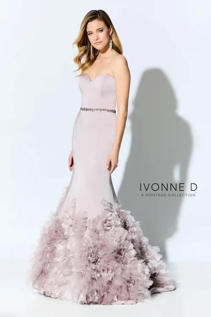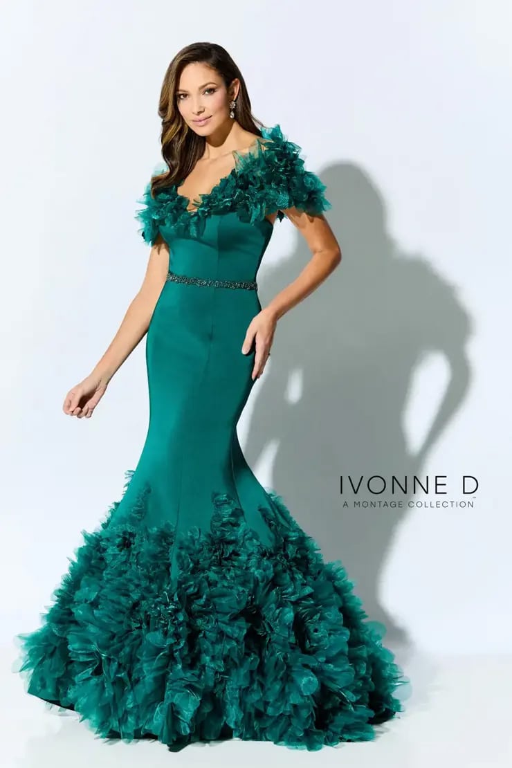 An over-the-top sleeveless strapless crepe mermaid gown with a sweetheart neckline, and a 3D organza layered skirt. Crepe belt, detachable beaded belt, detachable three-dimensional organza collar included, and detachable straps included.