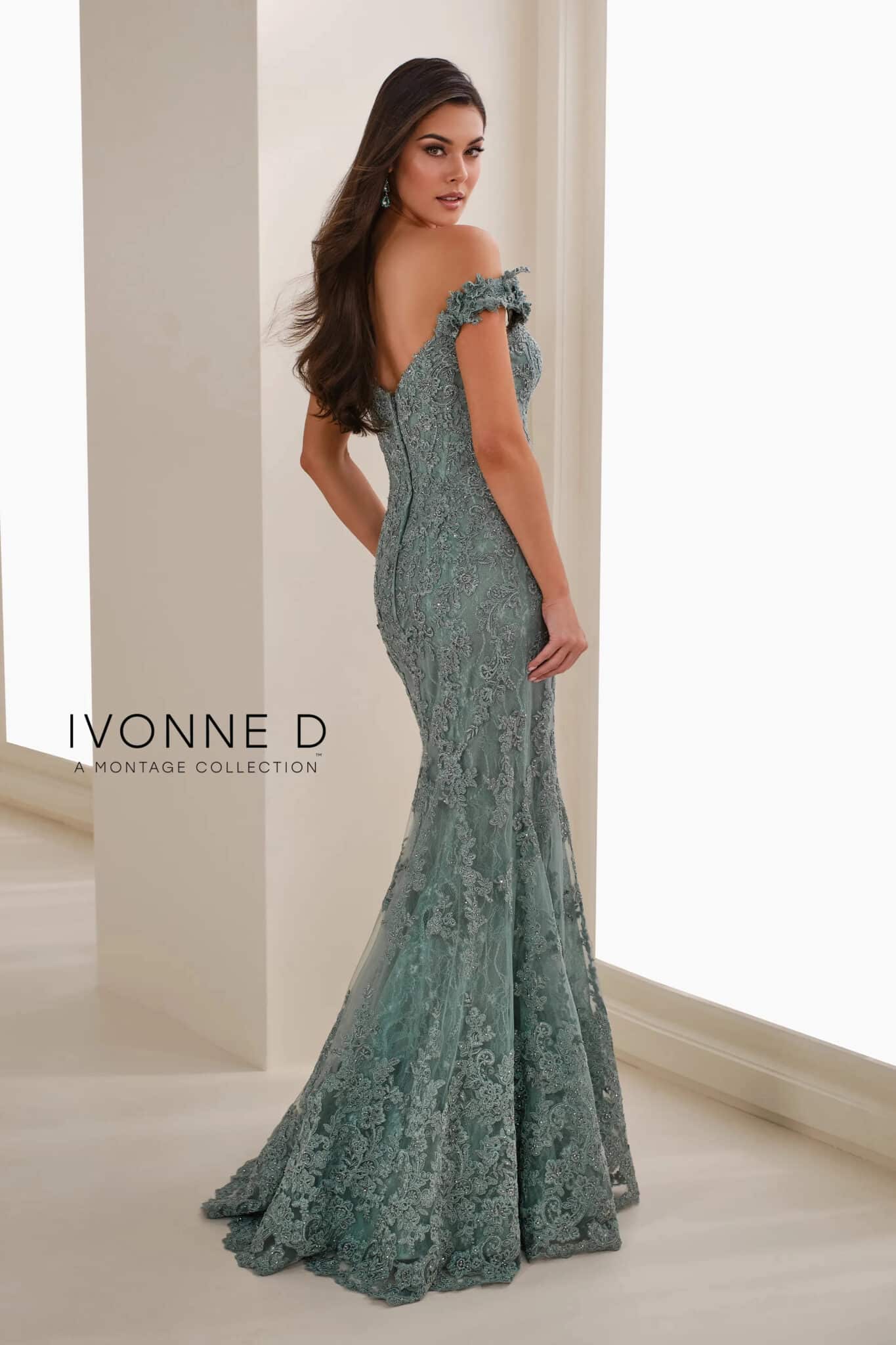 A stunning off-the-shoulder lace gown featuring intricate beading and a flattering mermaid silhouette. Designed with a plunging sweetheart neckline and floral appliqué details for an elegant finish. Includes an allover lace shawl and separate three-quarter sleeves for added versatility.