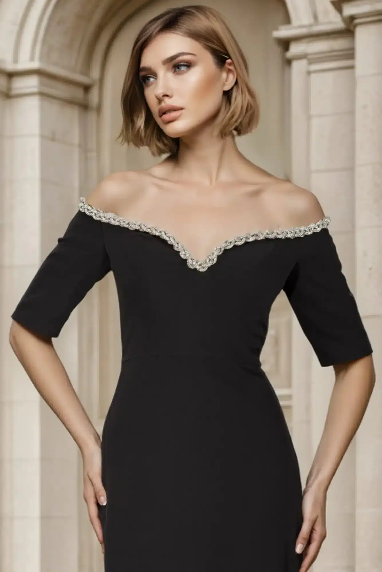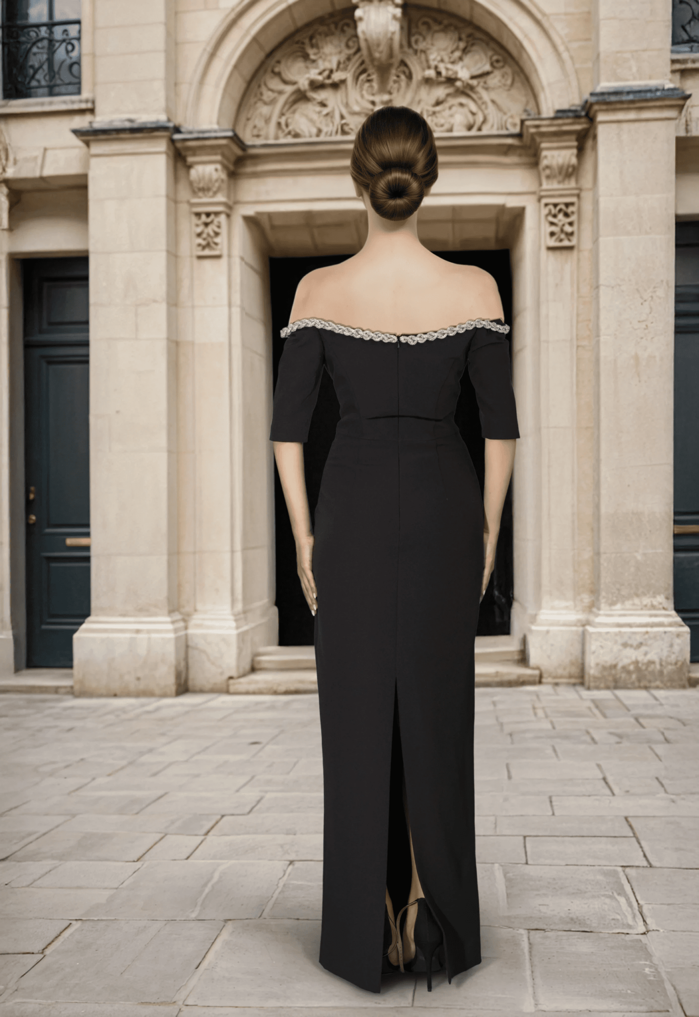 Classic and sophisticated, Janique style 2604 is an elegant mother of the bride gown designed with timeless appeal. The off-the-shoulder neckline is beautifully framed with delicate beaded trim, adding a refined touch of sparkle. Featuring sleek elbow-length sleeves and a fitted column silhouette, this gown creates a graceful, elongated look—perfect for a formal and polished wedding celebration.