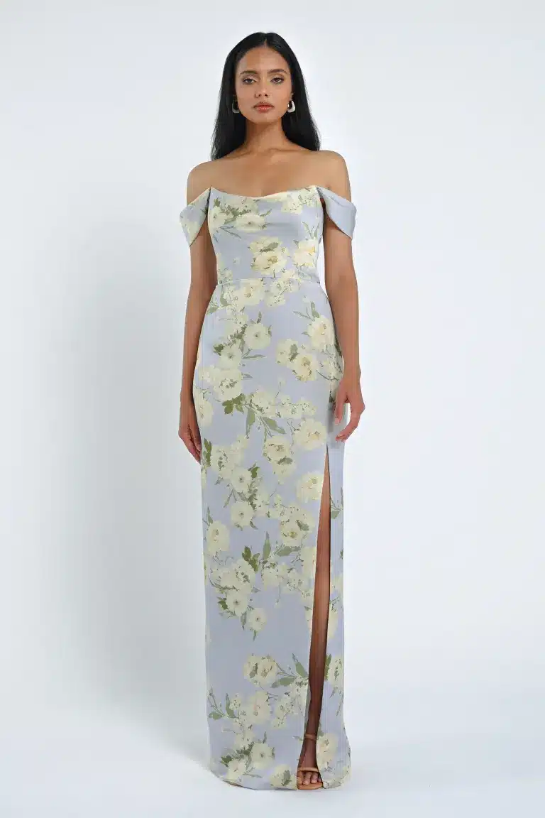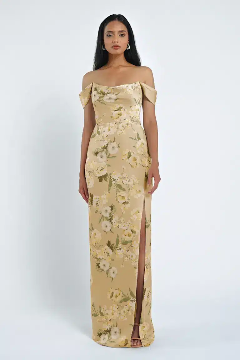 The Sawyer dress, cut in our beautifully romantic new Verona printed satin features elegantly draped off the shoulder sleeves and a soft cowl neckline. Her bodice is fully boned with bust cups for support and an effortlessly flattering fit. Her slim skirt features a cutaway slit for an alluring peek of skin.