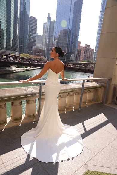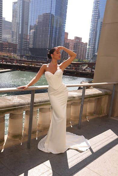 Adena is a stunning fitted satin wedding dress with corset bodice and basque waist. With long detachable sleeves and midsize train.