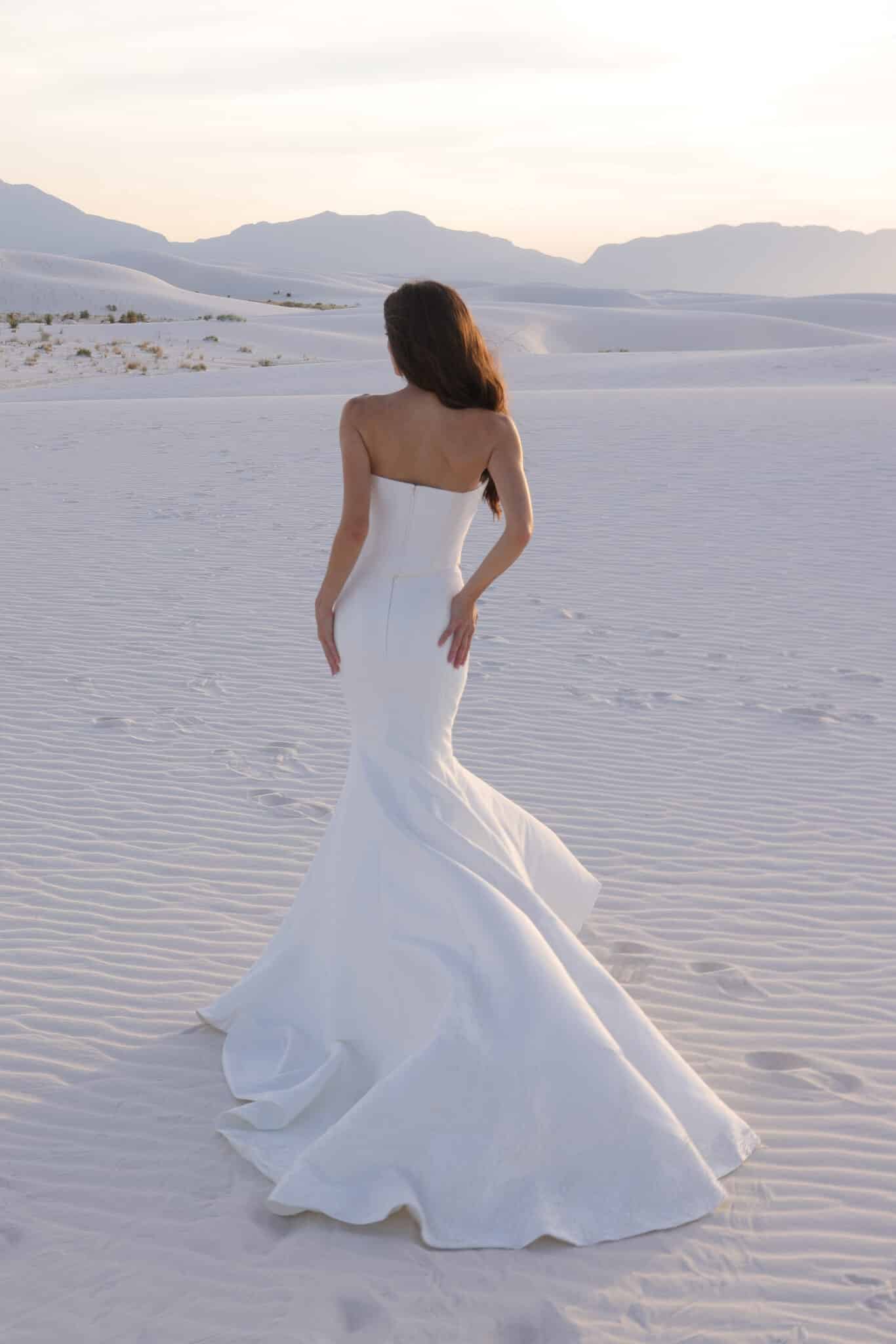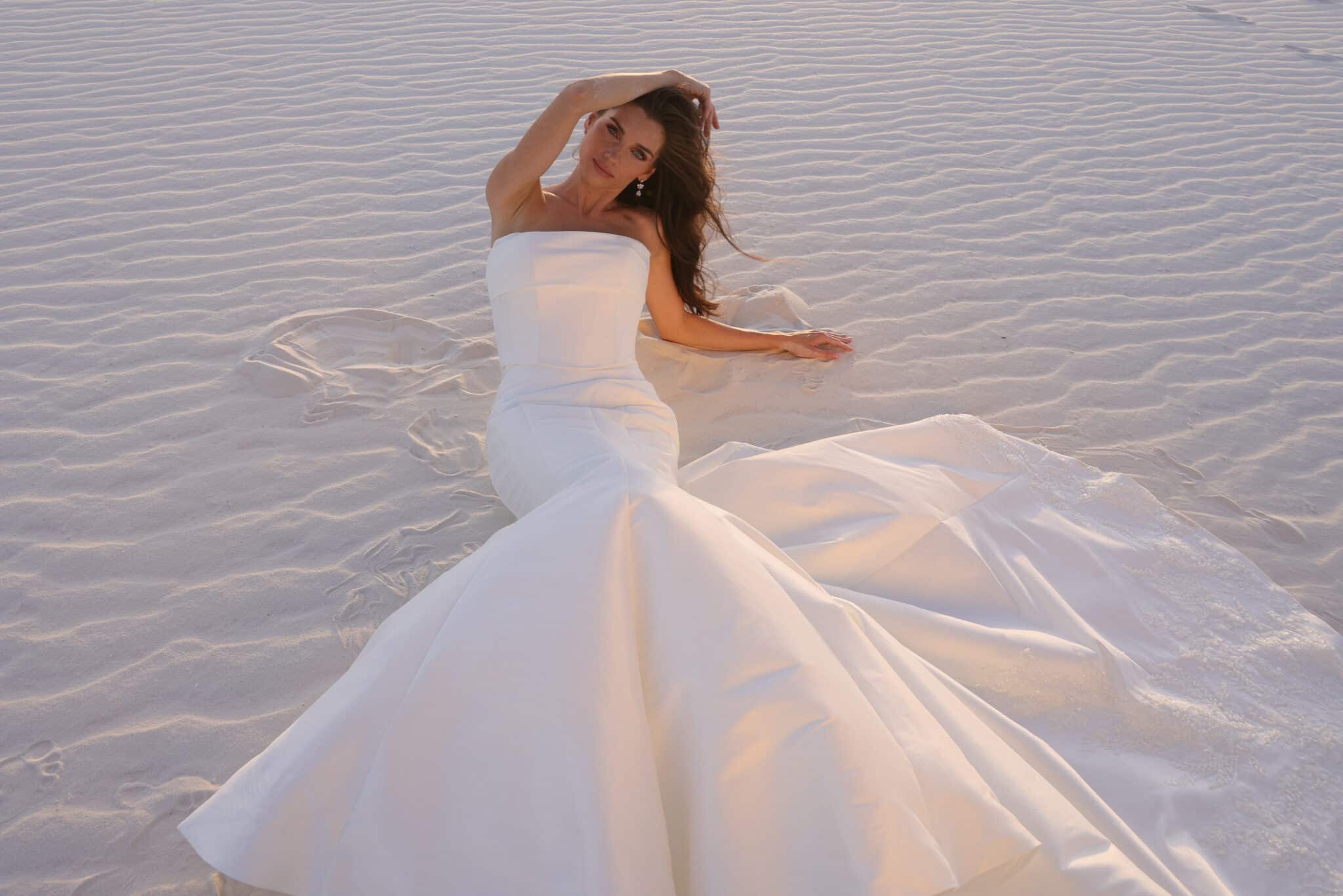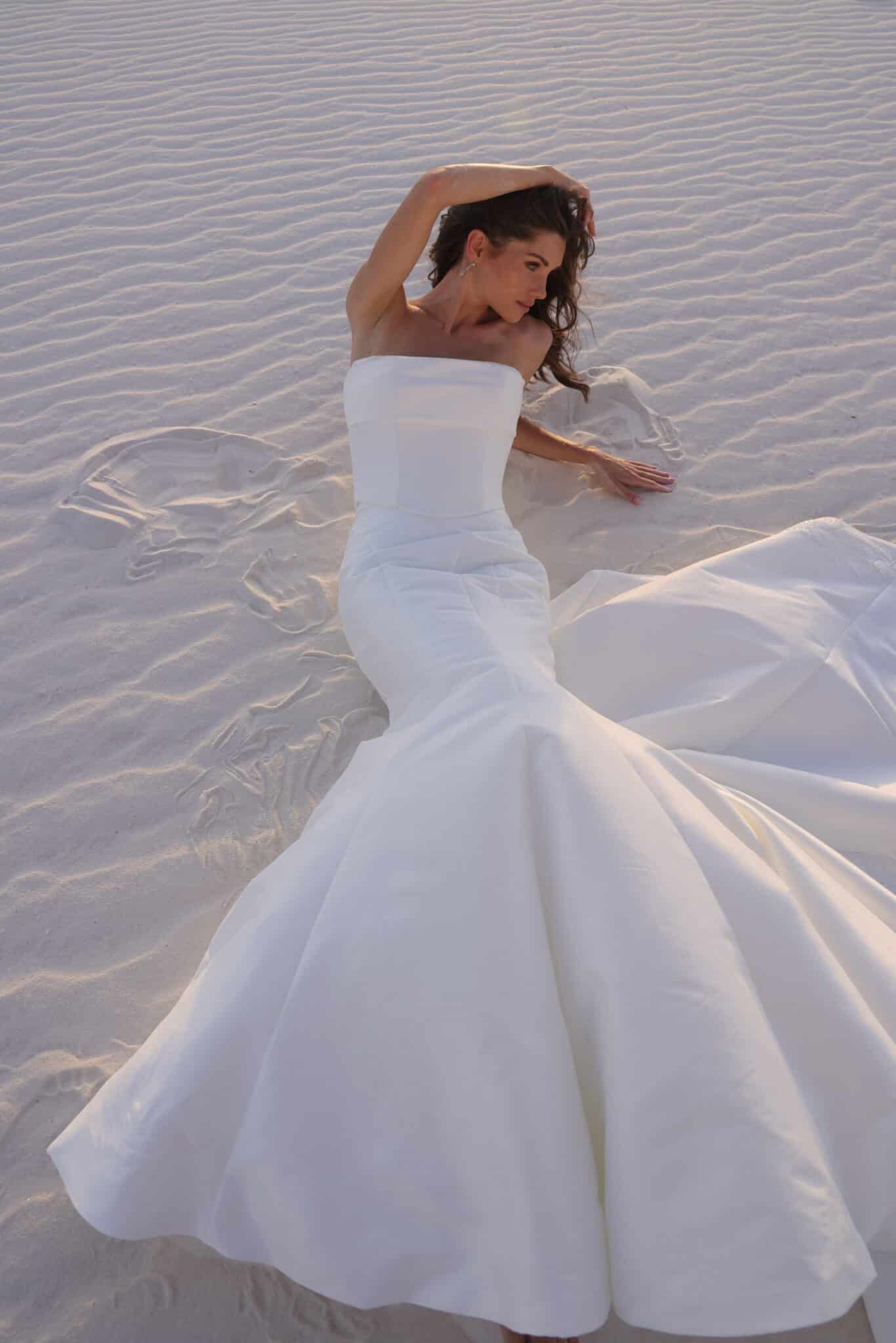 A study in modern elegance, this strapless gown features a clean, sculpted bodice that seamlessly flows into a softly flared skirt with a sweeping train. Crafted from smooth, structured fabric, the silhouette highlights the waist while maintaining an effortless, minimalist feel. Timeless and refined, this gown is perfect for the bride who loves understated drama and contemporary sophistication.