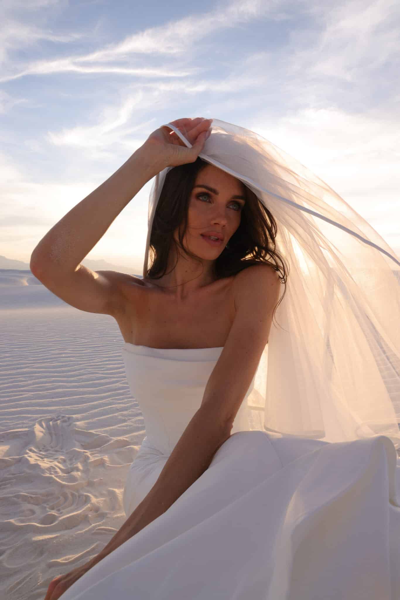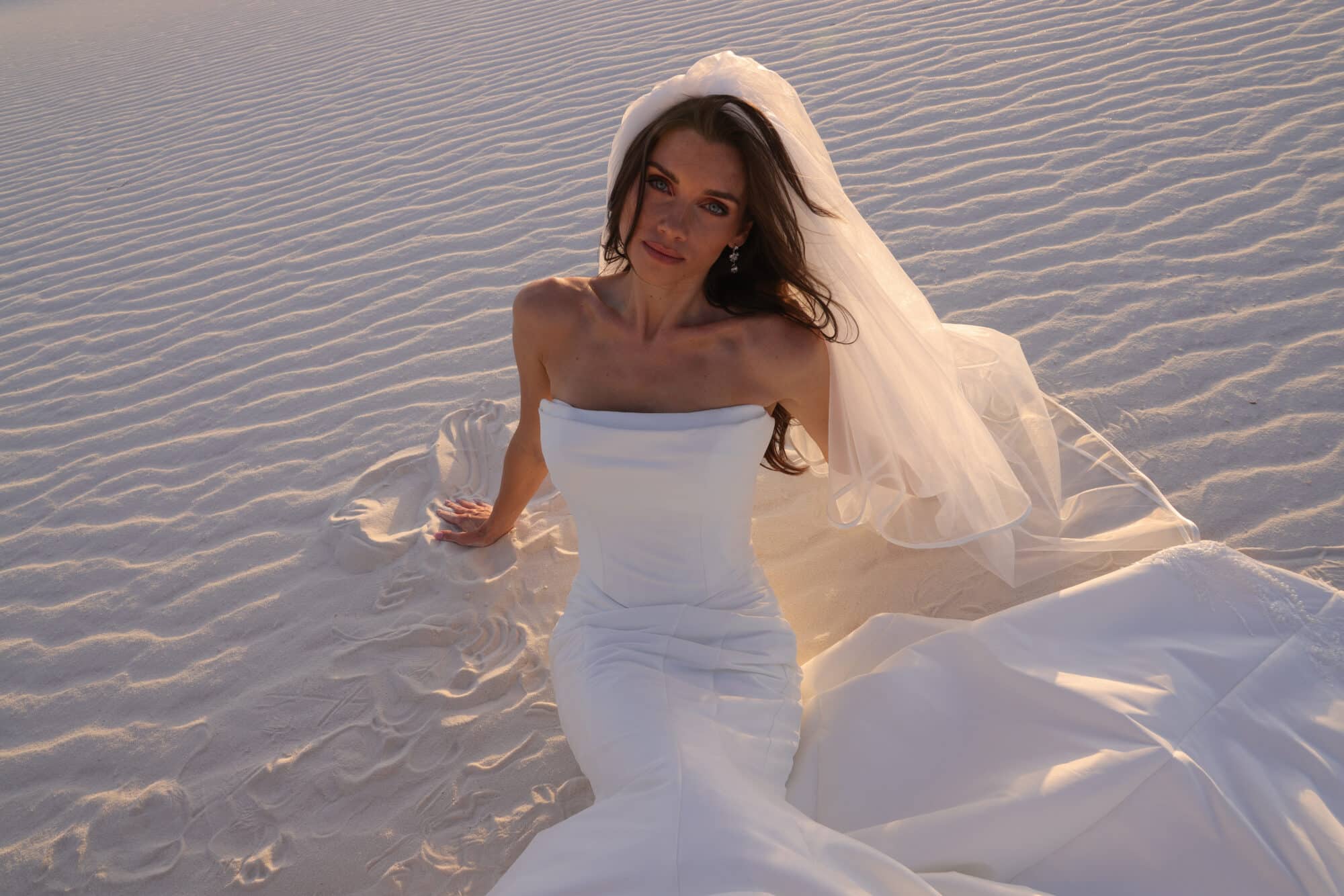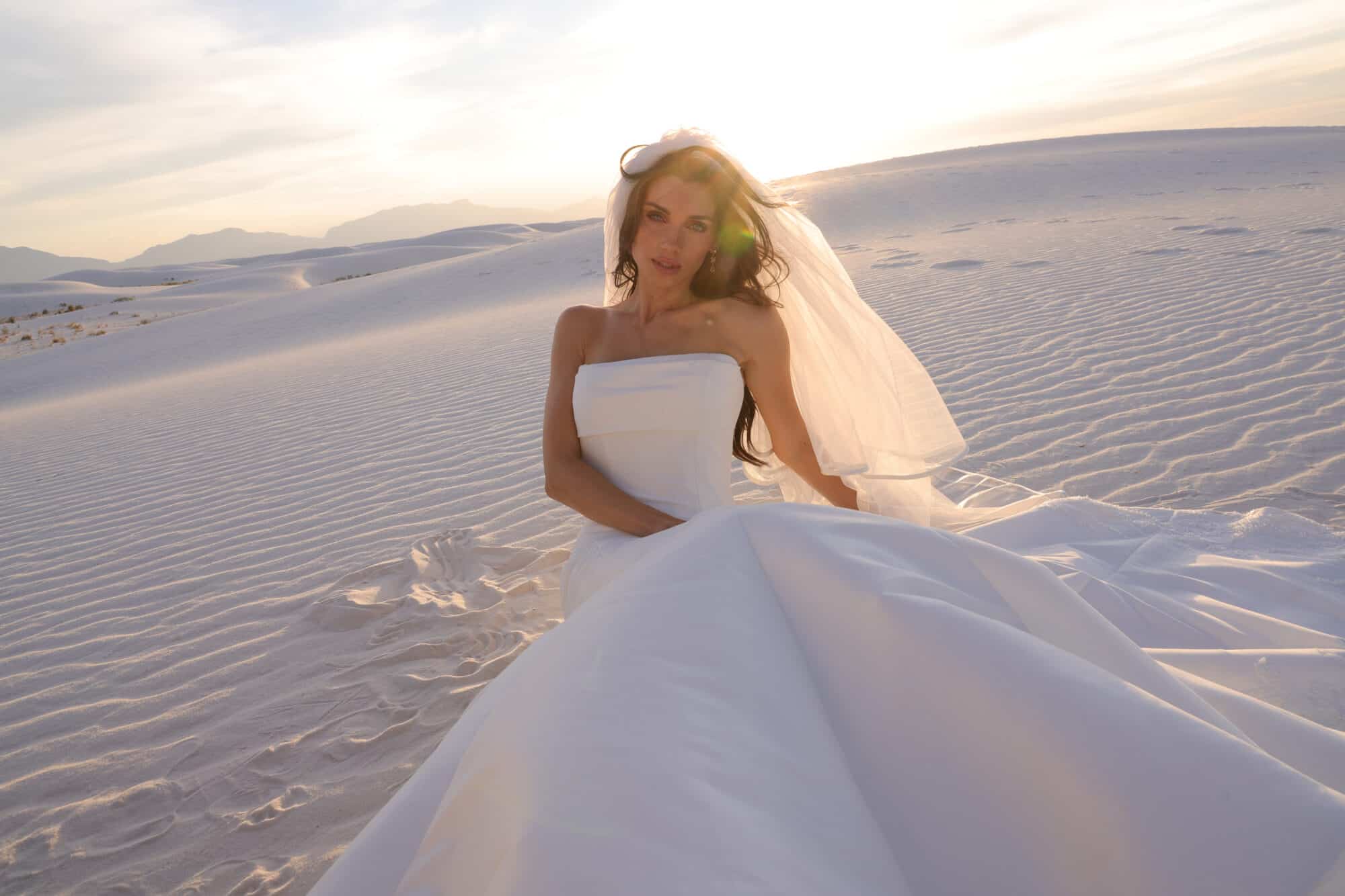 A study in modern elegance, this strapless gown features a clean, sculpted bodice that seamlessly flows into a softly flared skirt with a sweeping train. Crafted from smooth, structured fabric, the silhouette highlights the waist while maintaining an effortless, minimalist feel. Timeless and refined, this gown is perfect for the bride who loves understated drama and contemporary sophistication.