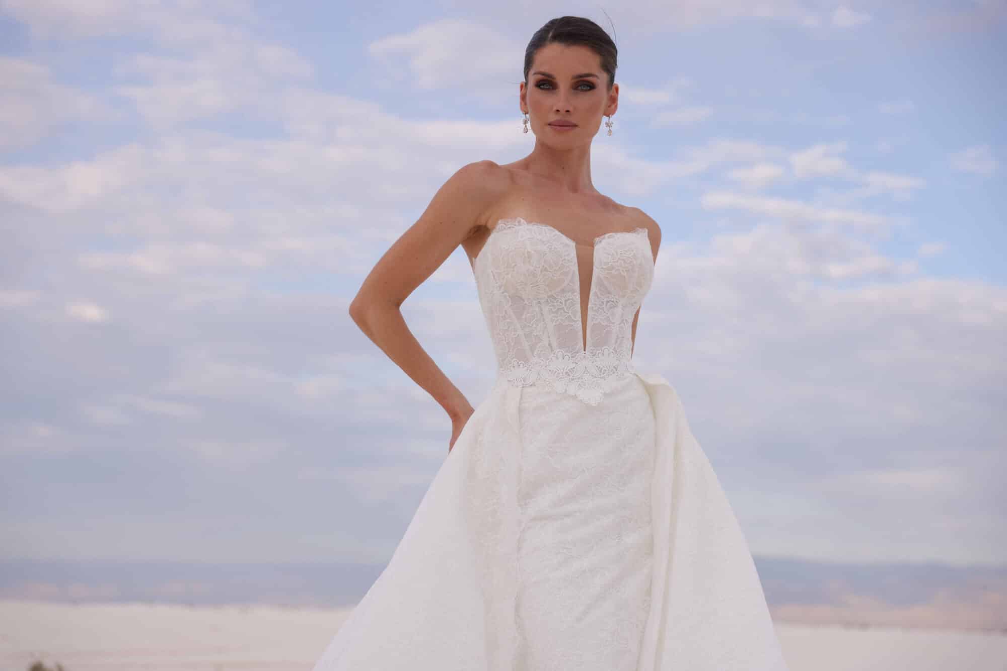 Chantilly lace column gown with removable inside skirt with detachable overskirt.