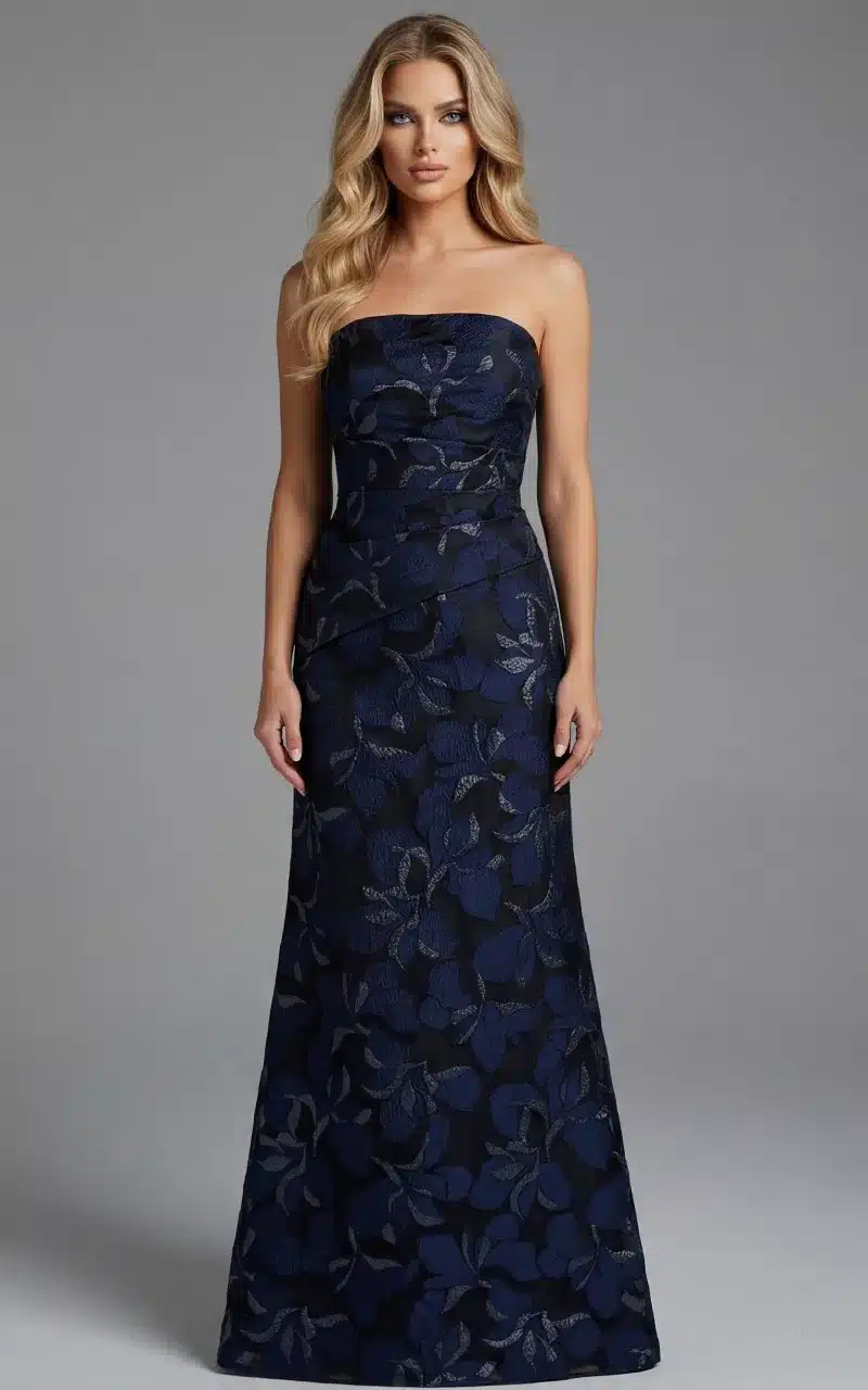 This stunning strapless A-line gown features exquisite floral embroidery throughout its full-length silhouette. The dress boasts a straight neckline, creating an elegant frame for the décolletage. Perfect for sophisticated occasions, its luxurious texture and graceful flow offer an enchanting presence. The gown is complemented by a matching shawl, adding a touch of versatility and style.