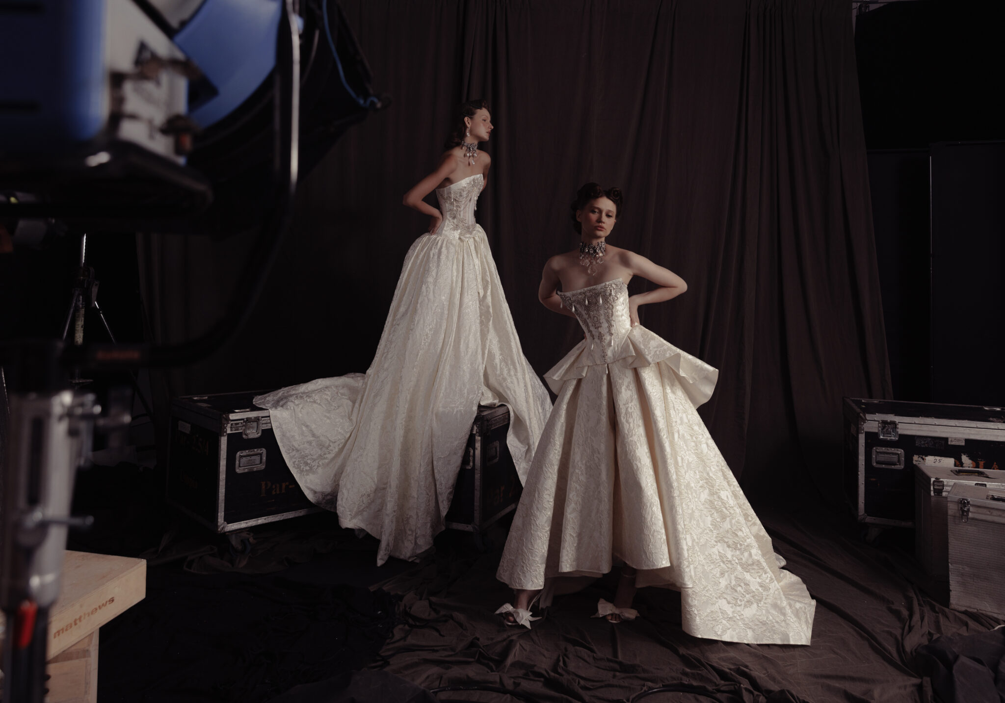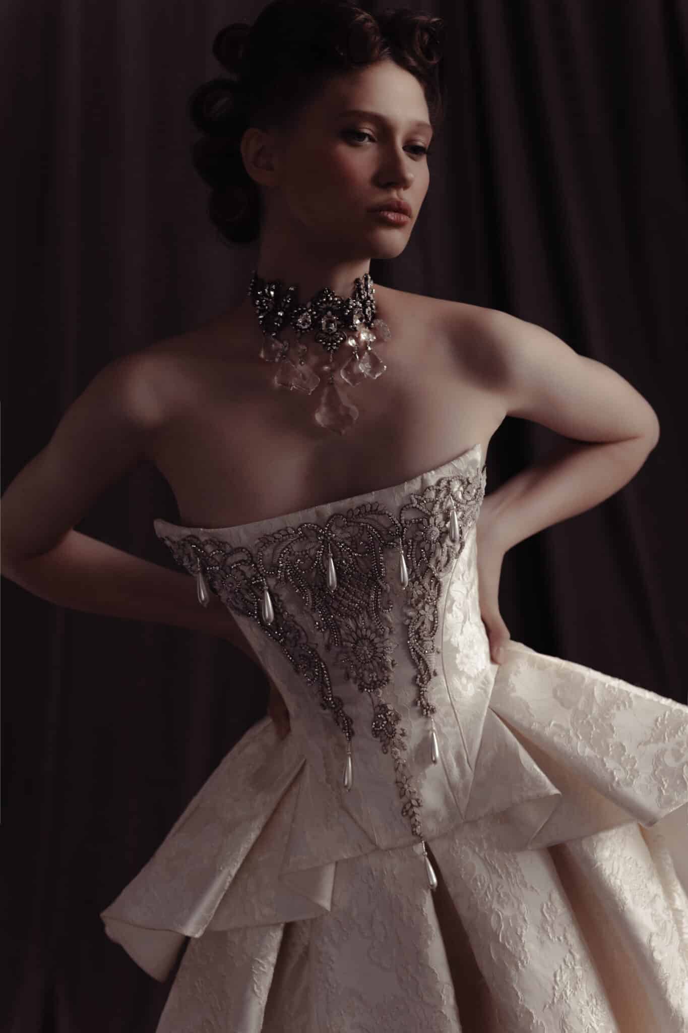 Gloria by Kim Kassas Couture is a regal, sculptural ball gown designed for the bride who wants a look that is both timeless and strikingly couture. Crafted in a rich jacquard fabric, the gown features a structured strapless corset adorned with intricate beading and delicate hanging pearl details—an unmistakable signature of Kim Kassas’ artisanal craftsmanship. The skirt showcases dramatic architectural layering at the waist, cascading into a full, sweeping train that adds volume and movement without overwhelming the silhouette. The textured jacquard brings depth and dimension from every angle, giving the gown an opulent, Old World elegance with a modern couture twist.