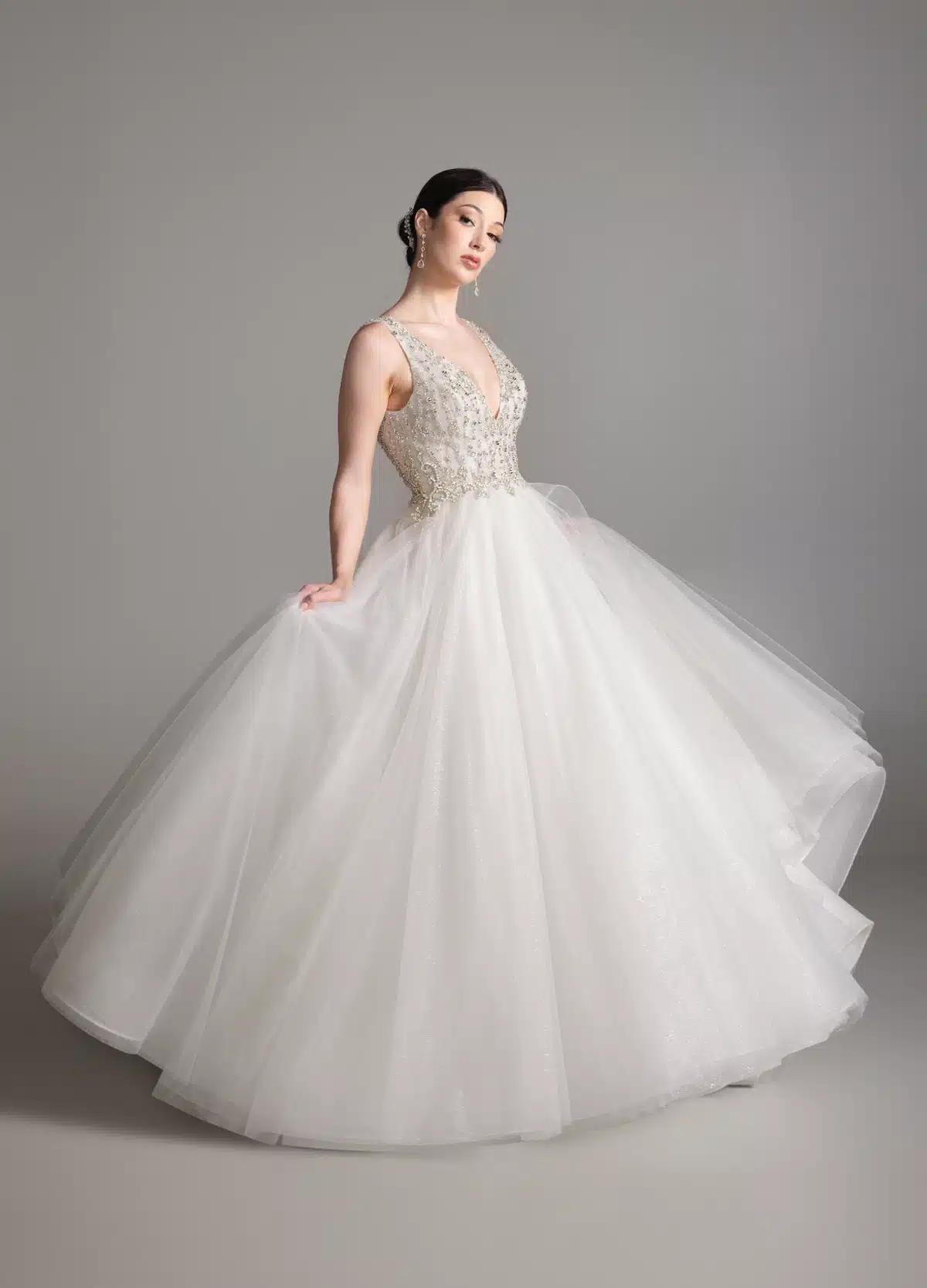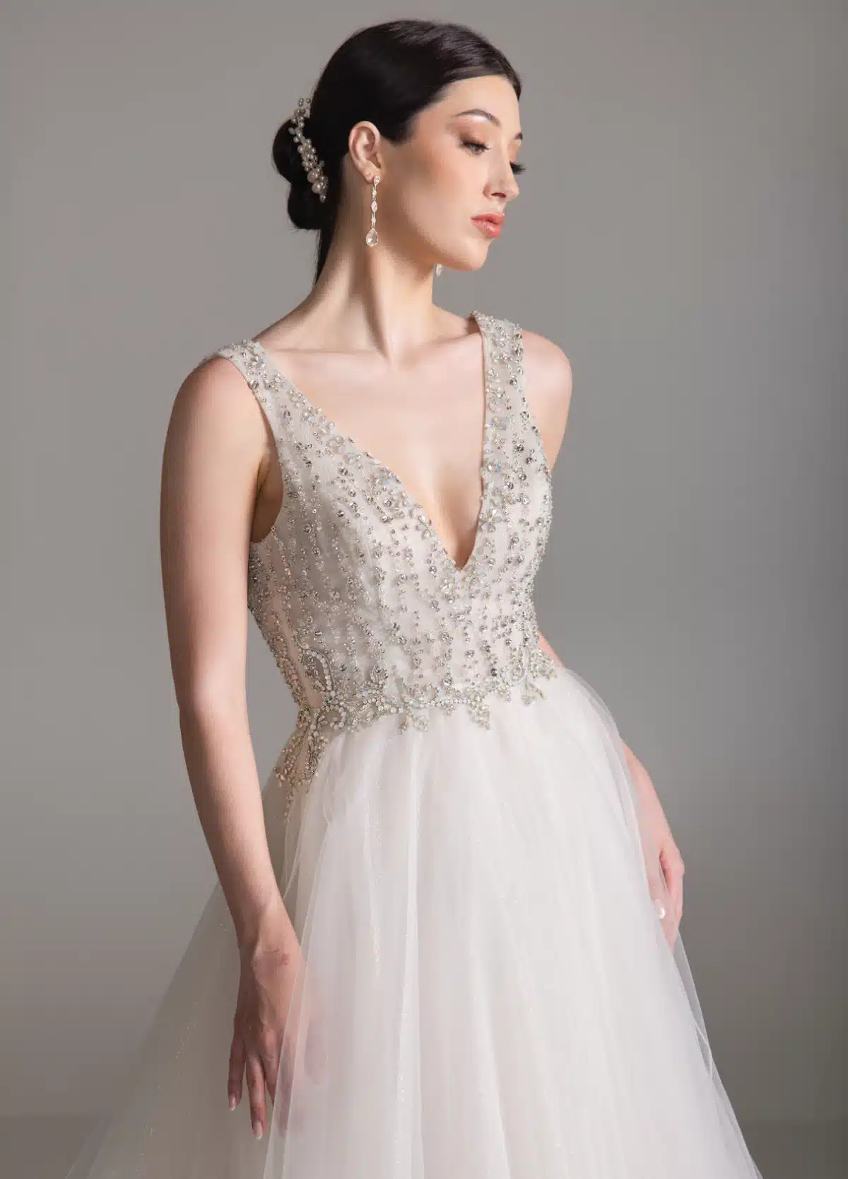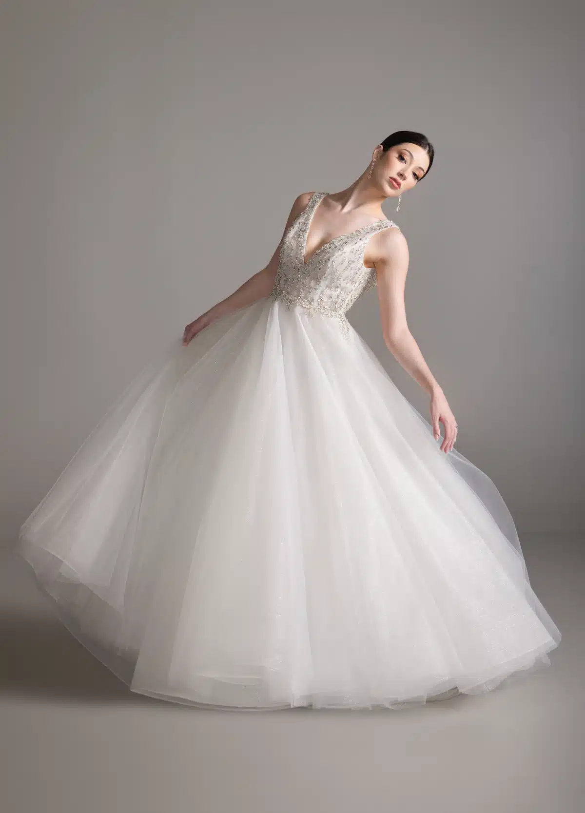 Briar is a diamond white shimmer tulle ball gown silhouette with a natural waist and a full circular skirt that flows into a chapel train. A V-neckline and jeweled bodice adorned with opal crystals create a luminous, couture-inspired focal point. The overall look feels radiant and romantic, designed for the bride who wants soft sparkle with timeless elegance.