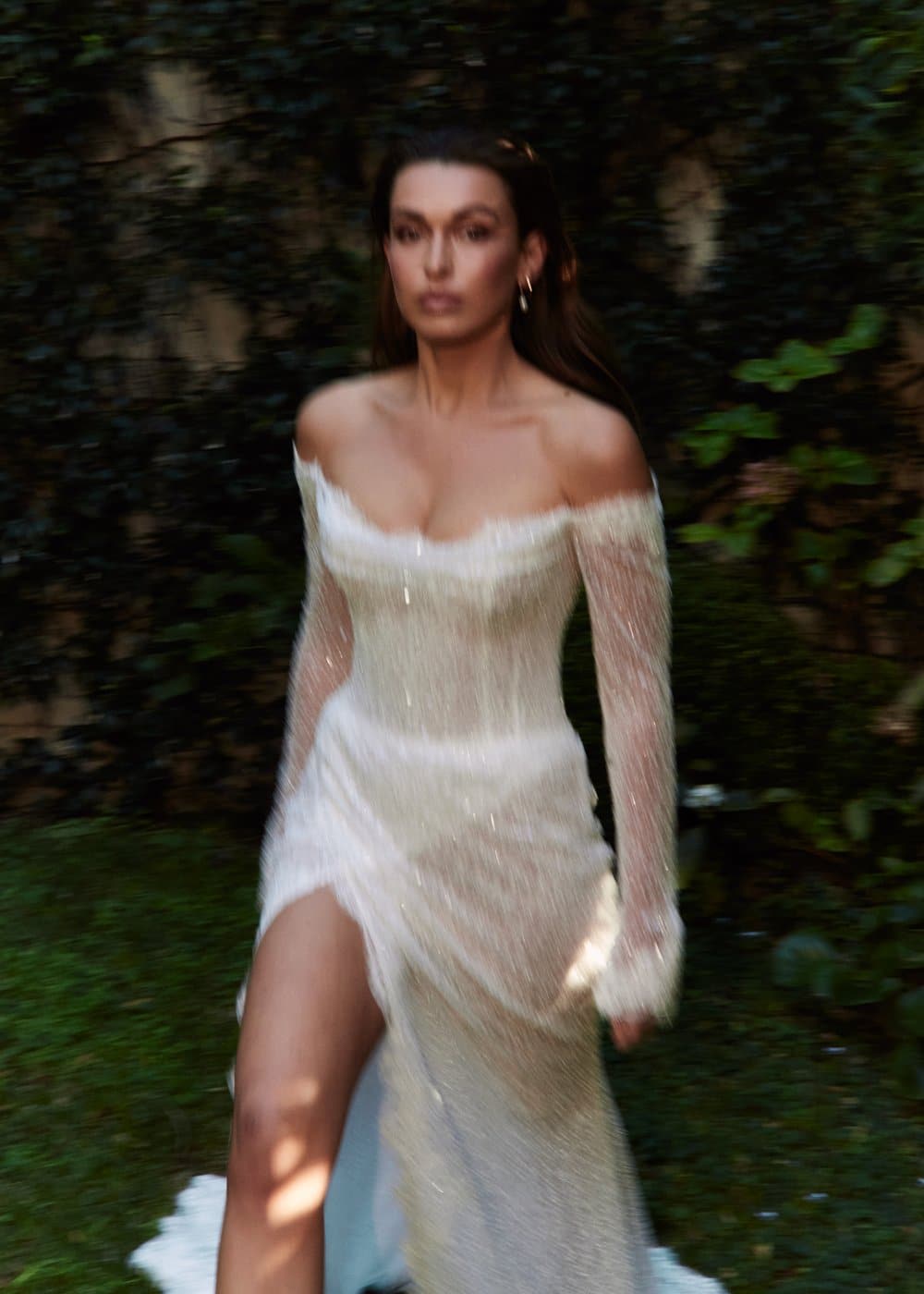 Crafted from luxurious sparkle fabric, this wedding gown embodies glamour with its fitted sheath silhouette, featuring a daring thigh-high slit and elegant off-the-shoulder long sleeves. The gown's allure is heightened by delicate Chantilly lace trim gracing the edges, adding a touch of romance to this sophisticated and show-stopping bridal ensemble.