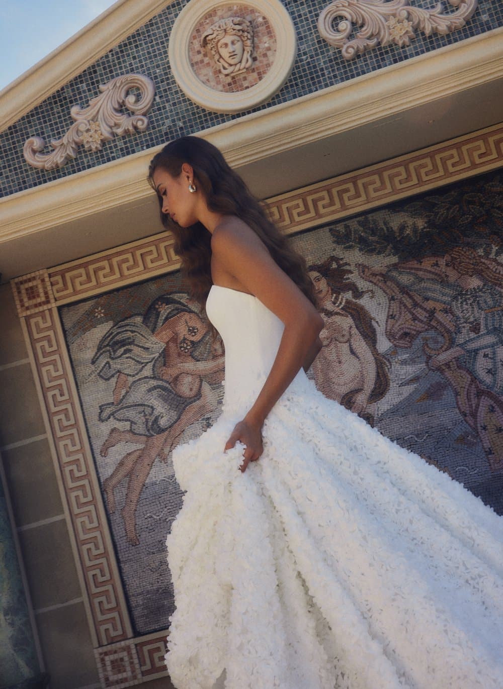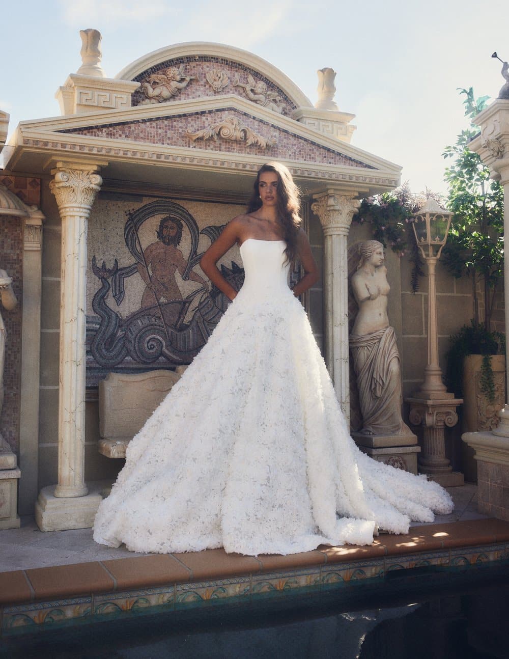 This exquisite couture wedding gown features a sleek strapless bodice that elegantly highlights the bride's neckline and shoulders. The voluminous ball gown skirt is adorned with delicate, hand-sewn floral appliqués, adding a luxurious texture and romantic charm. The dress seamlessly blends classic sophistication with modern design, making it perfect for a grand, opulent wedding setting.