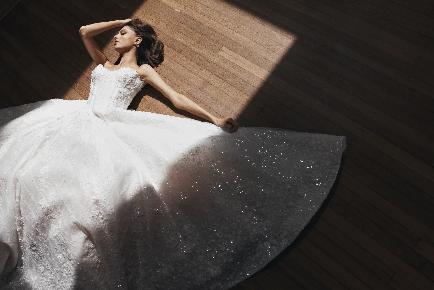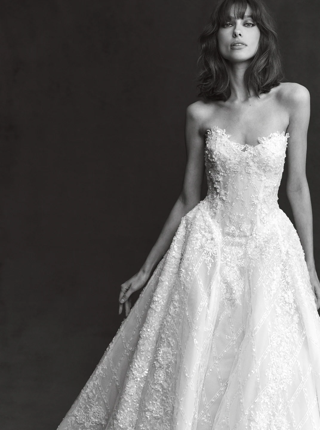 The Capri gown by Leah Da Gloria is a radiant masterpiece crafted for the bride who craves opulence and artistry. Its sculpted strapless corset is adorned with tonal 3D florals and shimmering beading, creating a romantic, textural bloom across the bodice. The full ball gown skirt dazzles with a lattice-embroidered overlay and cascading sequin embellishments that catch the light from every angle, giving Capri its signature luminous effect.