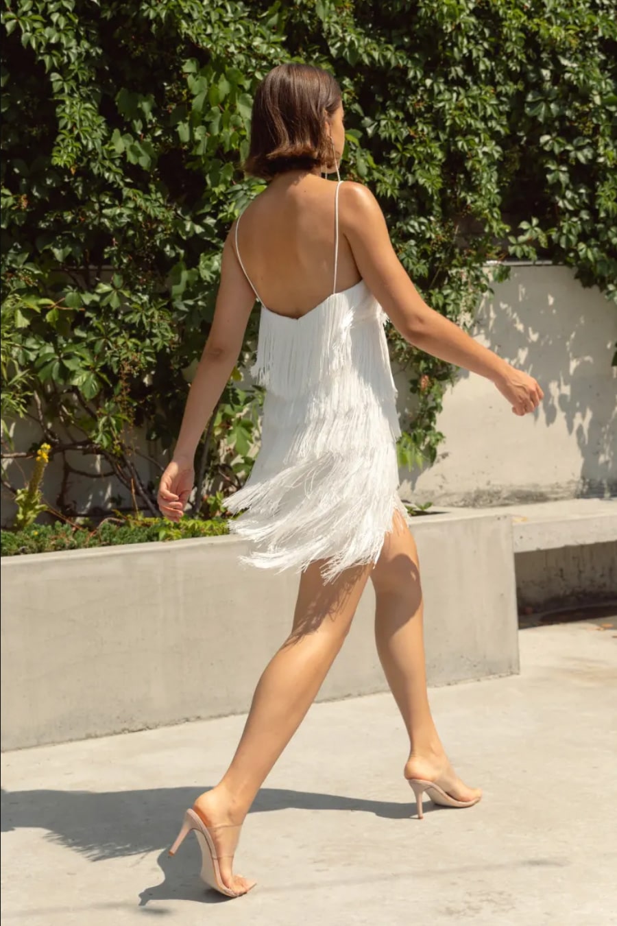 Layers of tiered fringe adorn this chic mini dress making her the perfect plus one for any of your bridal events!