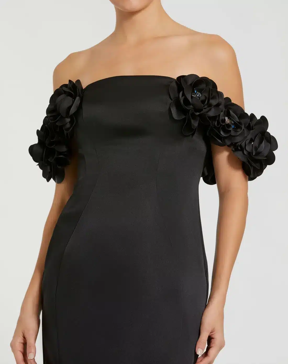 An elegant satin gown featuring an off-the-shoulder neckline with 3D floral appliqués and beaded accents on the sleeves. Designed with a soft mermaid silhouette and gentle flare, this timeless Black gown is perfect for the mother of the bride.