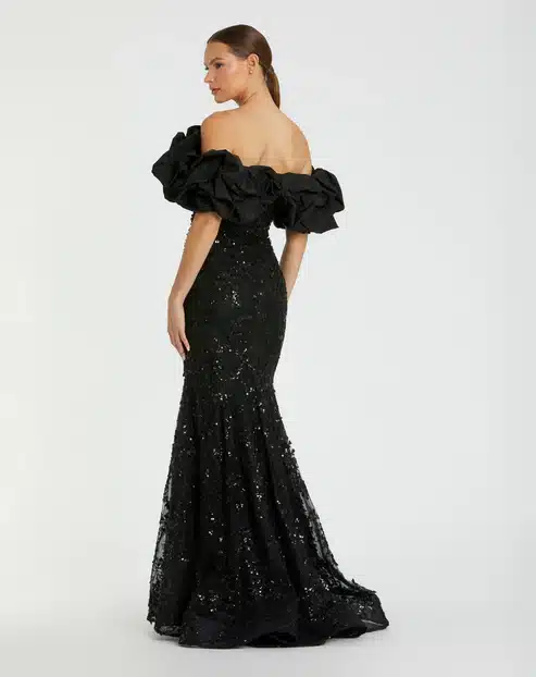 Striking and elegant, this gown is designed in embellished mesh with shimmering detail and a fully lined silhouette for a flawless fit. The off-the-shoulder neckline is paired with dramatic puff satin sleeves, adding a touch of couture glamour. Finished with a sweeping train and concealed back zipper, this timeless Black gown ensures a show-stopping entrance.