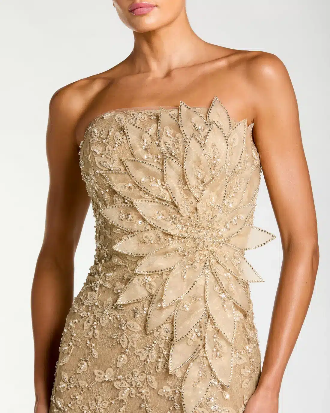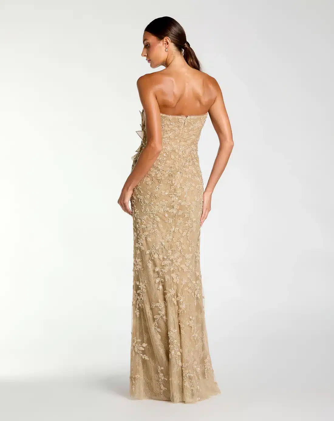 Radiating timeless glamour, this strapless mermaid gown by Mac Duggal is an exquisite choice for any formal occasion. Crafted from luxurious beaded fabric, the design features intricate embroidery and 3D floral appliqués that add captivating dimension and texture. The fitted silhouette accentuates the figure before softly flaring into a graceful hem, creating an effortlessly elegant shape. Fully lined for comfort, this gown embodies sophistication and artistry in every detail—a true statement piece for evening events or special celebrations.