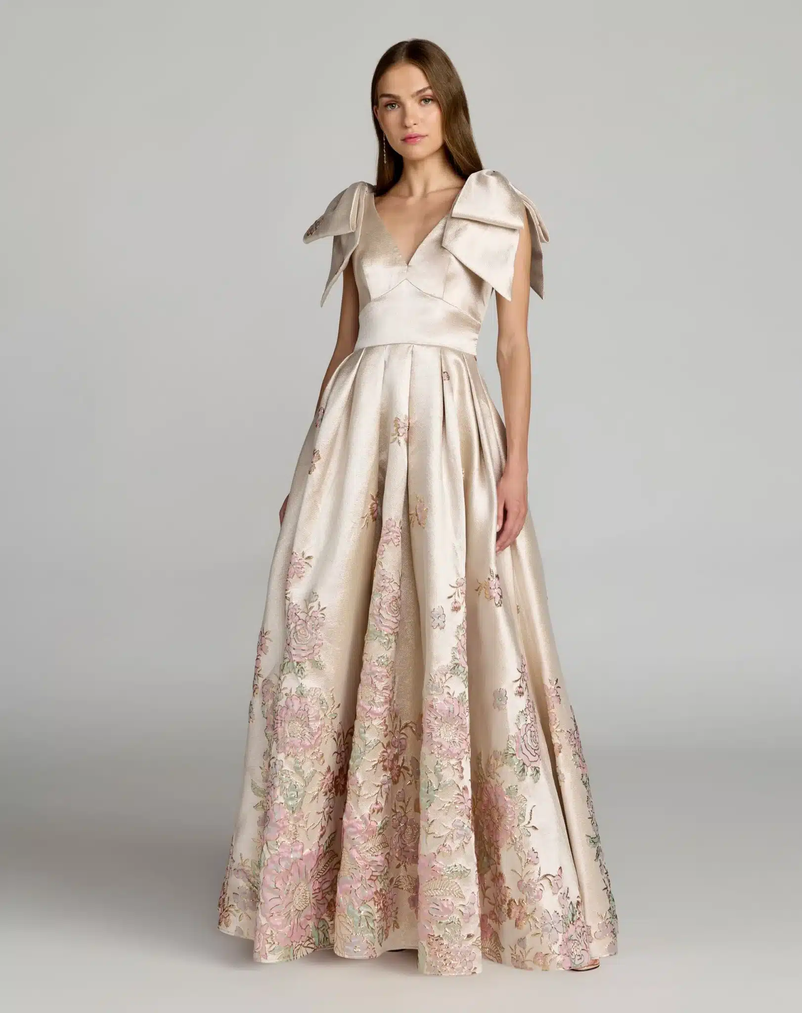 Crafted from luxurious brocade in a Champagne Multi hue, this Mac Duggal gown brings modern elegance to life. Fully lined and designed with a plunging V-neck and V-back, it features sleeveless styling and statement shoulder bows for a dramatic, feminine touch. The full skirt is adorned with delicate floral patterning, flowing gracefully to a 61" hem. Finished with a concealed back zipper, this gown is a stunning choice for a formal occasion, mother of the bride/groom, or any event where sophistication is key.