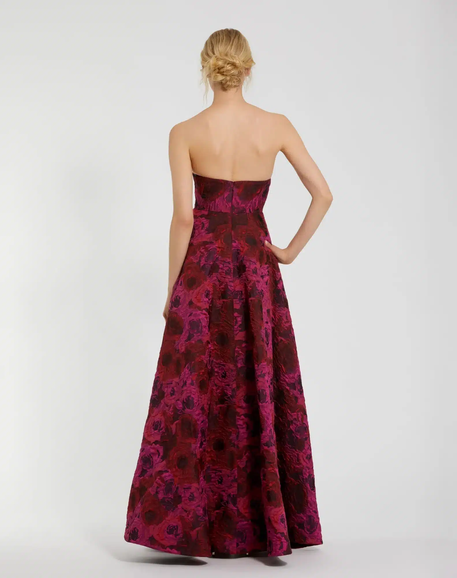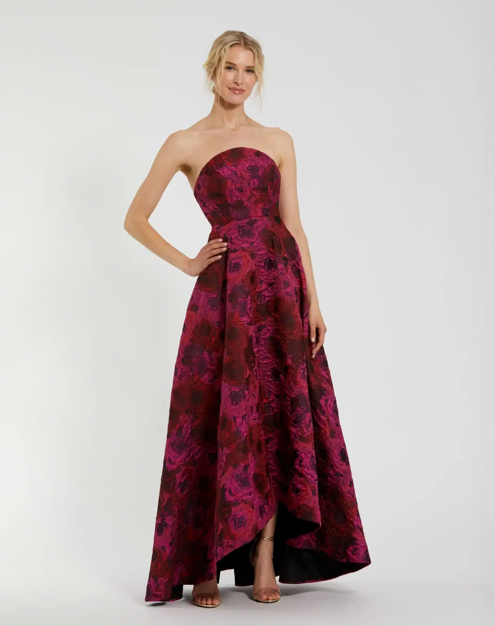 Crafted from luxurious brocade fabric, this gown features a high low hem and a flattering a-line silhouette. Perfect for formal events and special occasions, you're sure to make a statement.