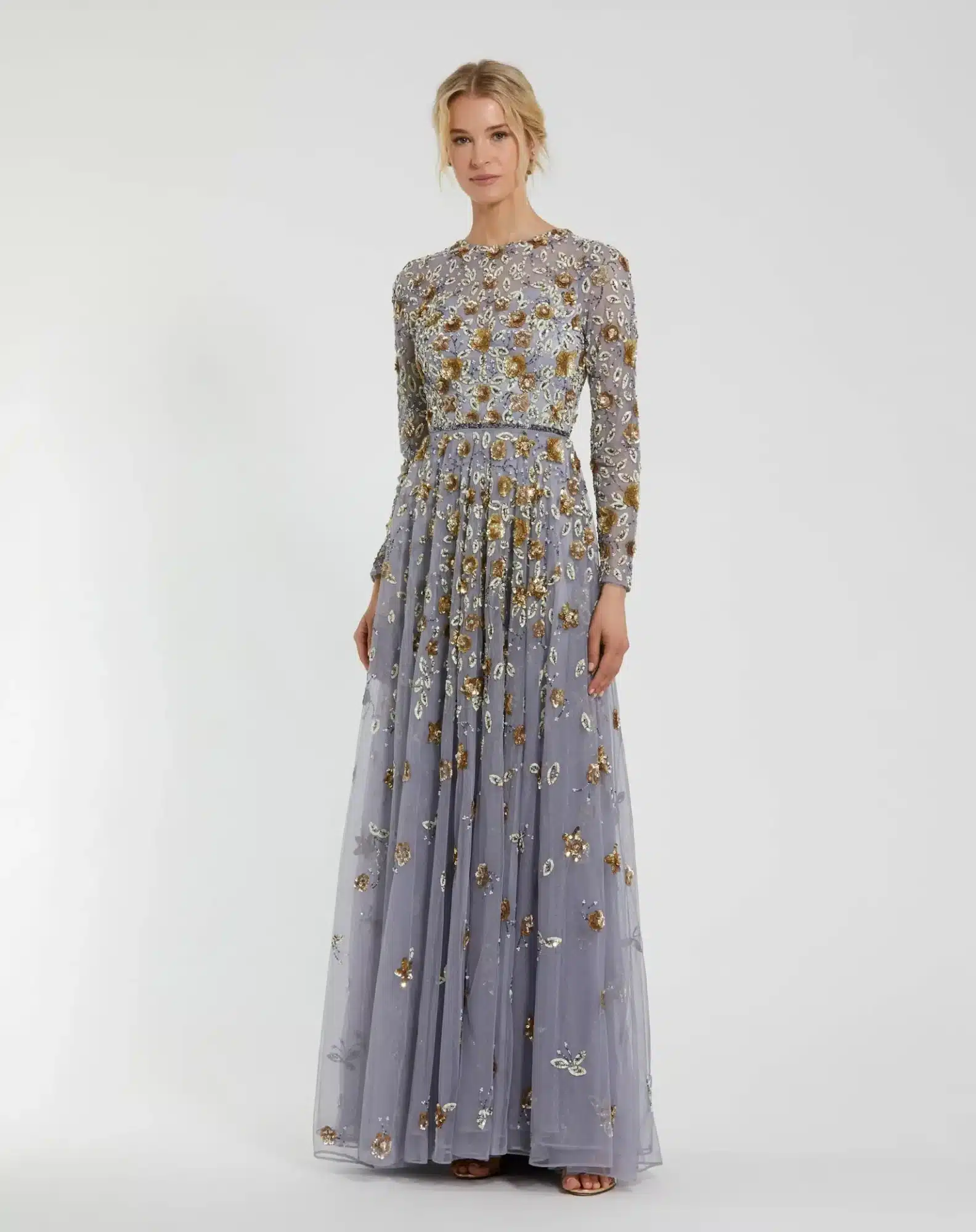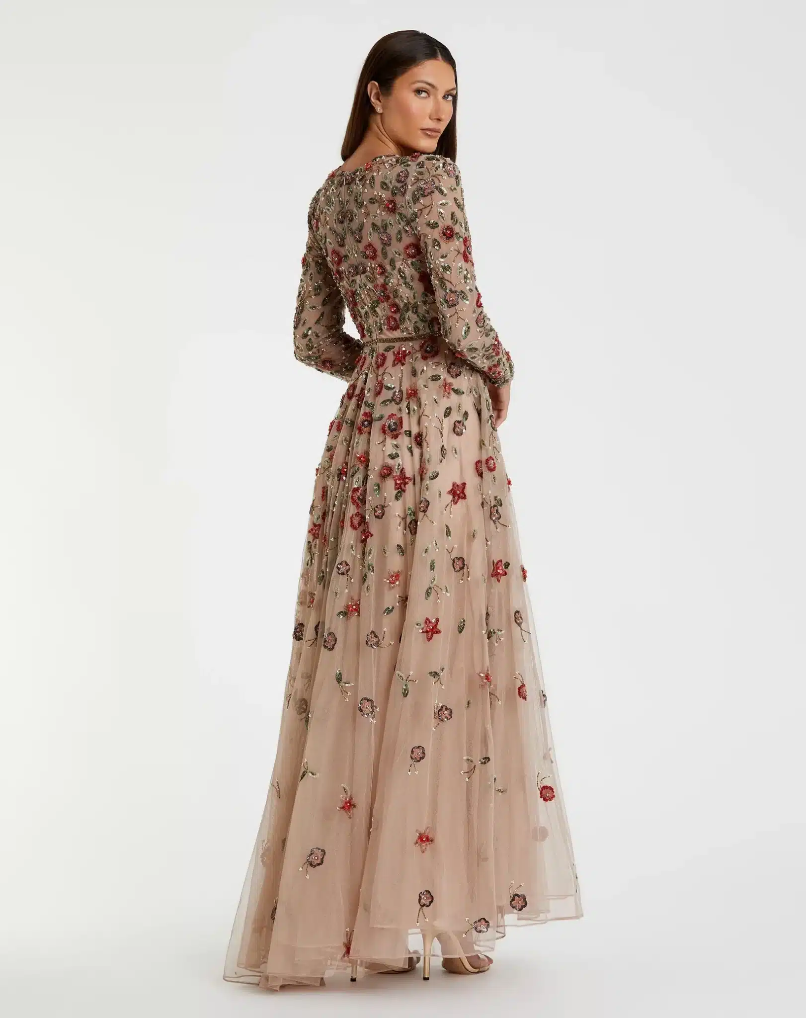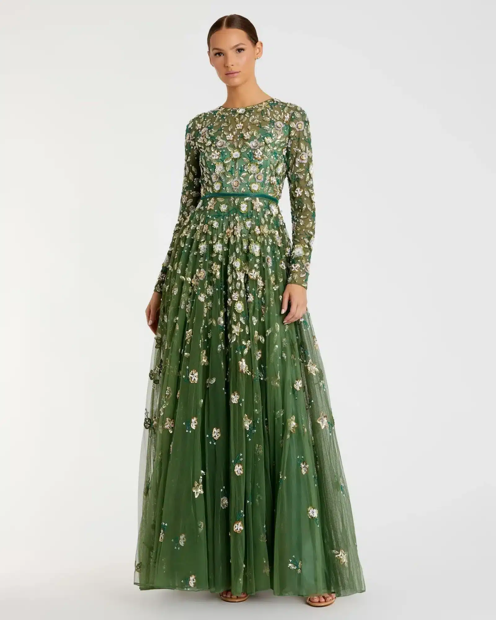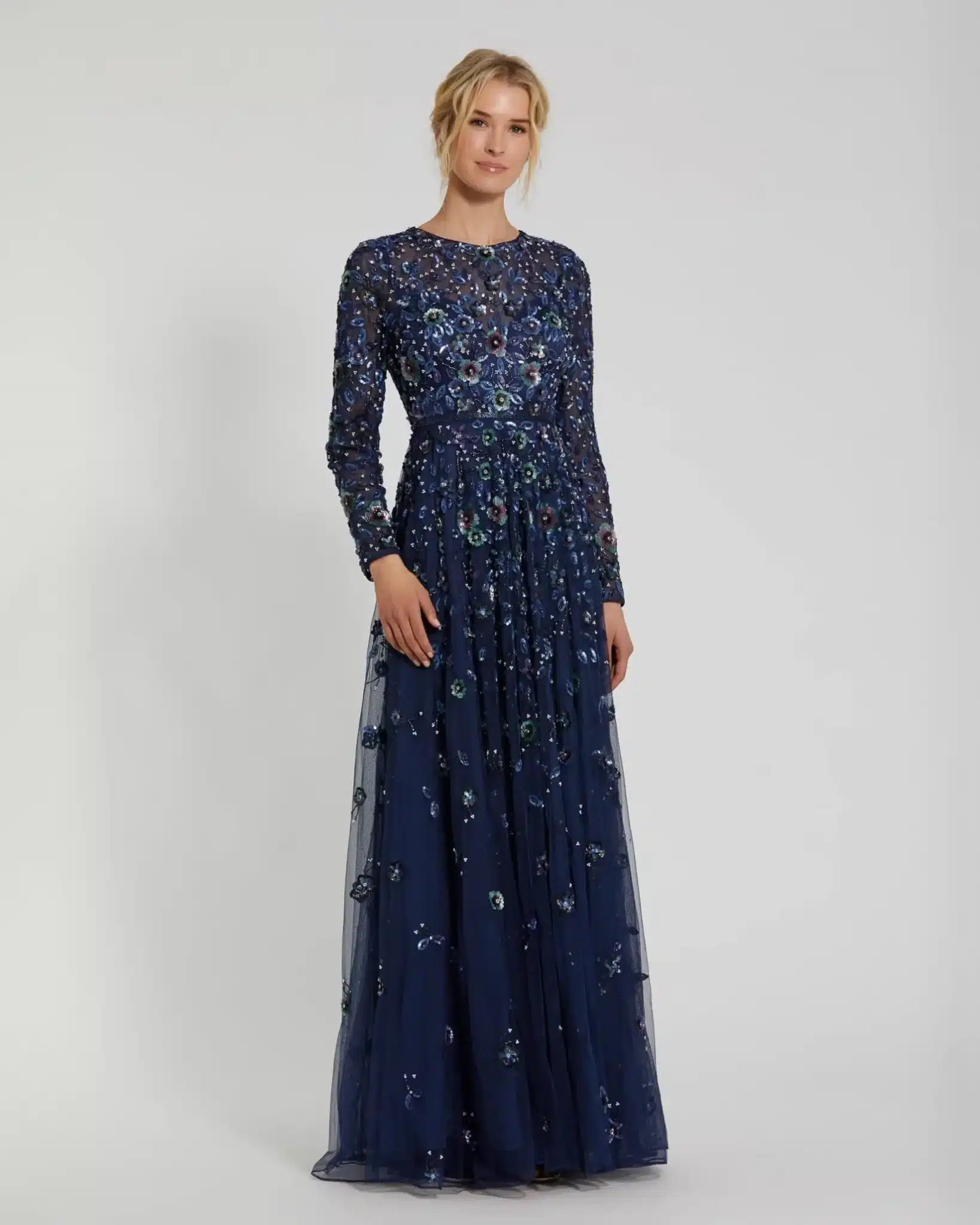 This embellished gown is a breathtaking blend of elegance and glamour. With its high neckline, long sleeves, and allover embellishments, its the perfect gown for evening affairs and black-tie events.
