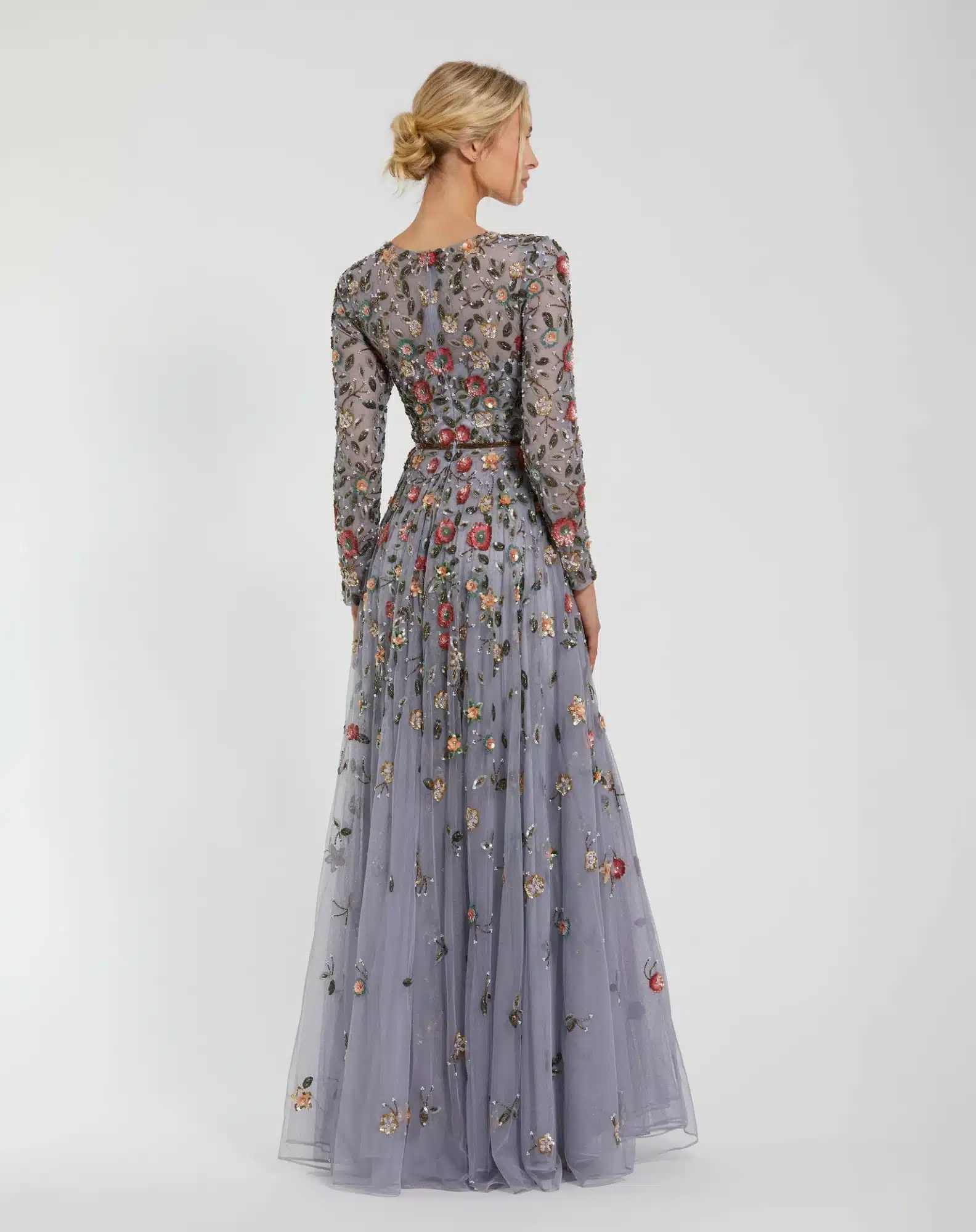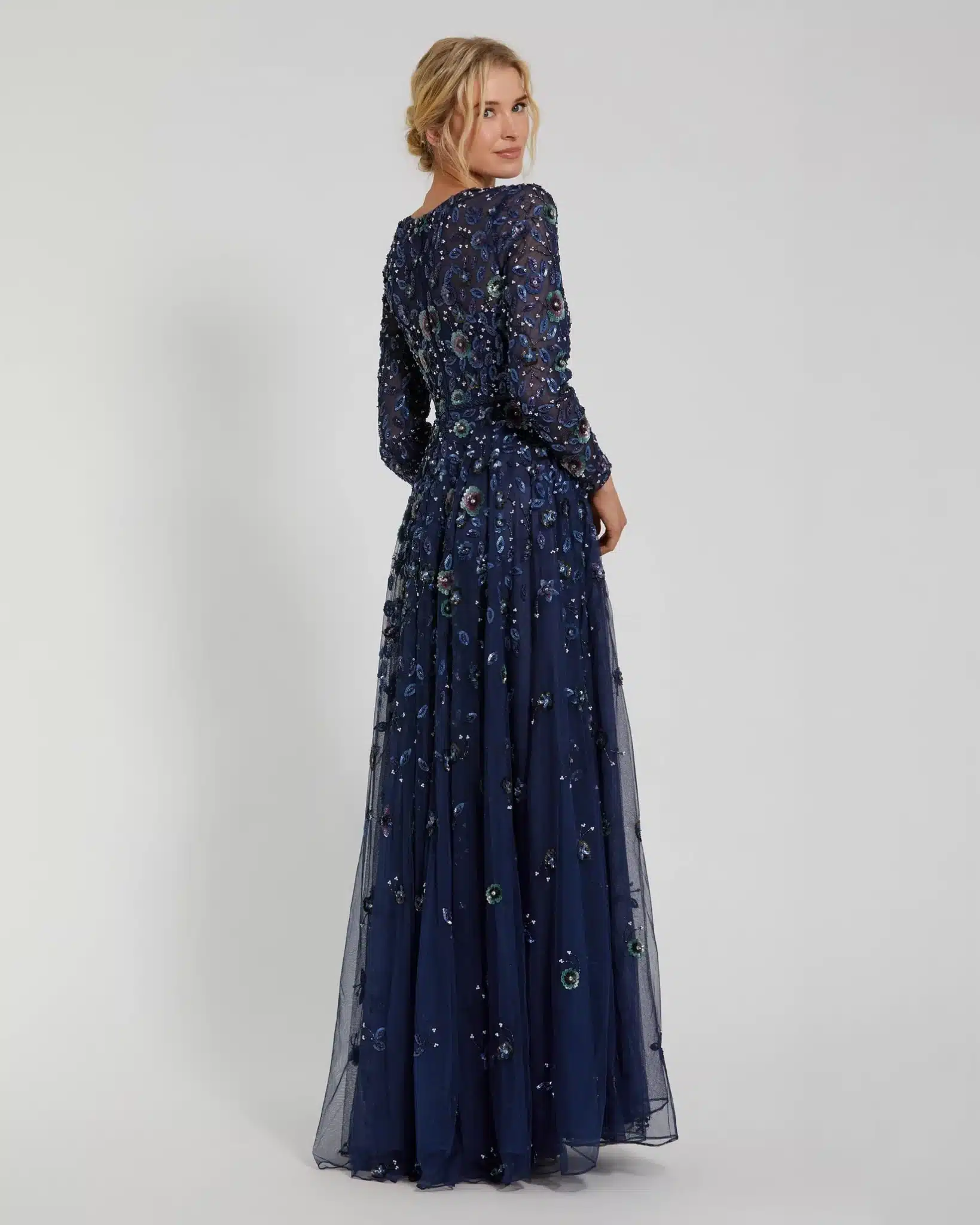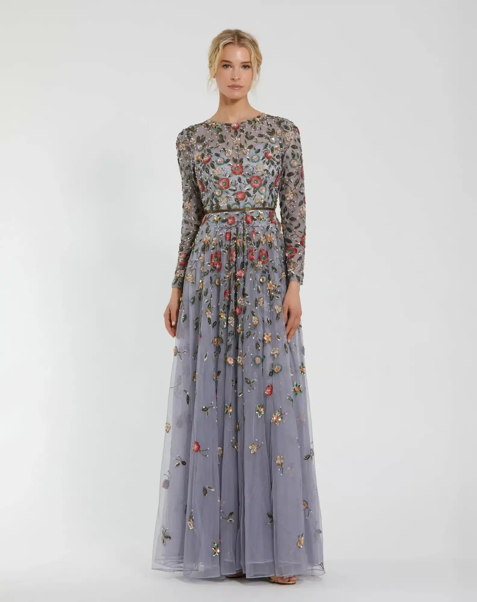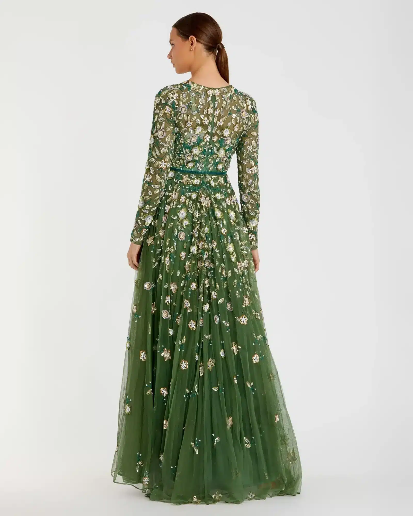 This embellished gown is a breathtaking blend of elegance and glamour. With its high neckline, long sleeves, and allover embellishments, its the perfect gown for evening affairs and black-tie events.