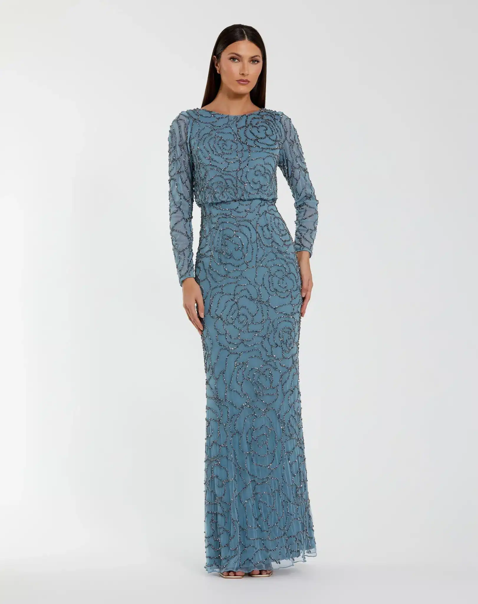 This Mac Duggal gown features a stunning beaded mesh fabric in Smoky Blue, with intricate silver rose embellishments cascading throughout the silhouette. The design is finished with a high round neckline, sheer long sleeves, and a fully lined body for comfort and elegance. Falling approximately 60" from shoulder to hem, this floor-length style offers a sleek, refined look and fastens with a concealed back zipper. Style #6189 — a sophisticated choice for evening events and mothers of the bride or groom.