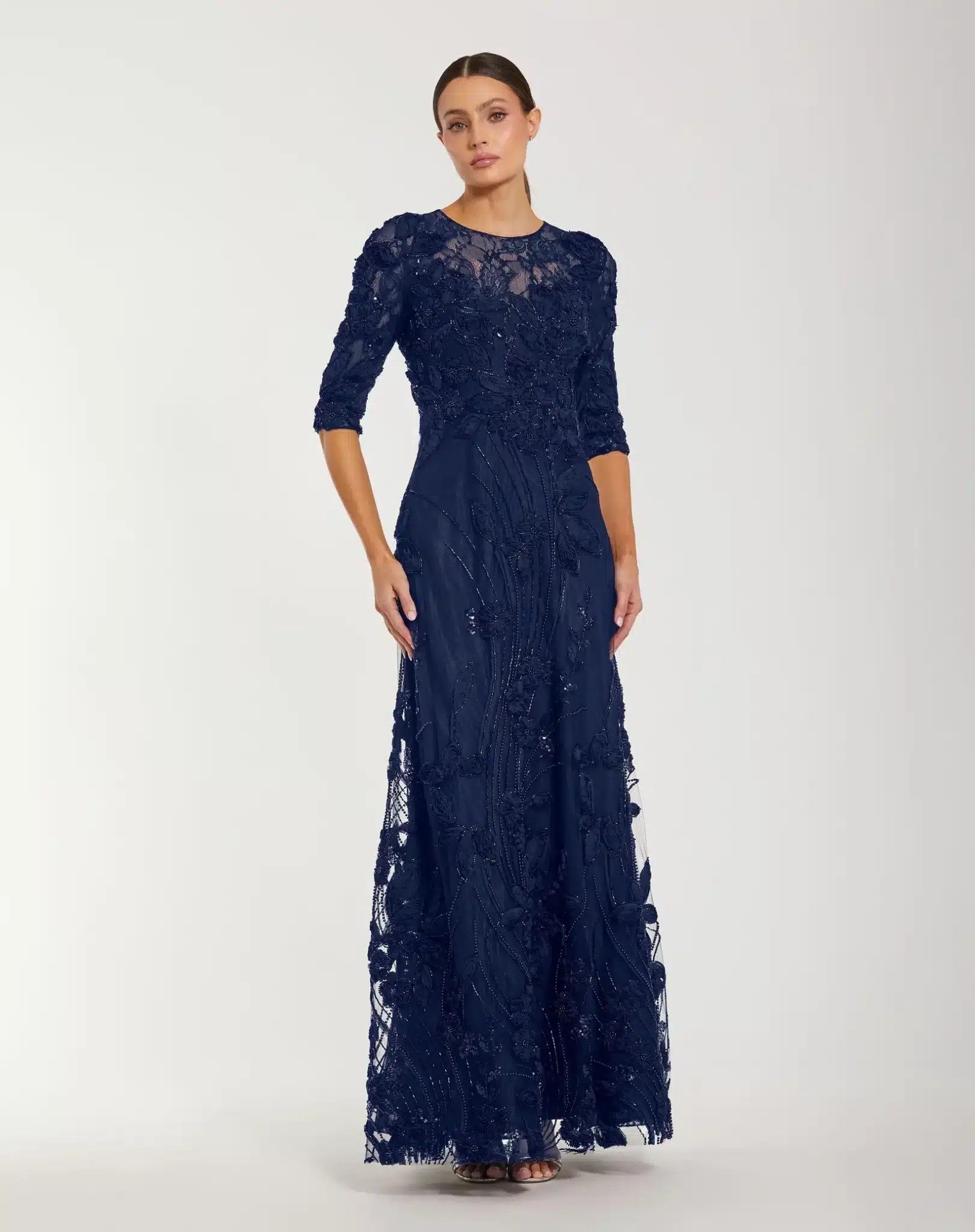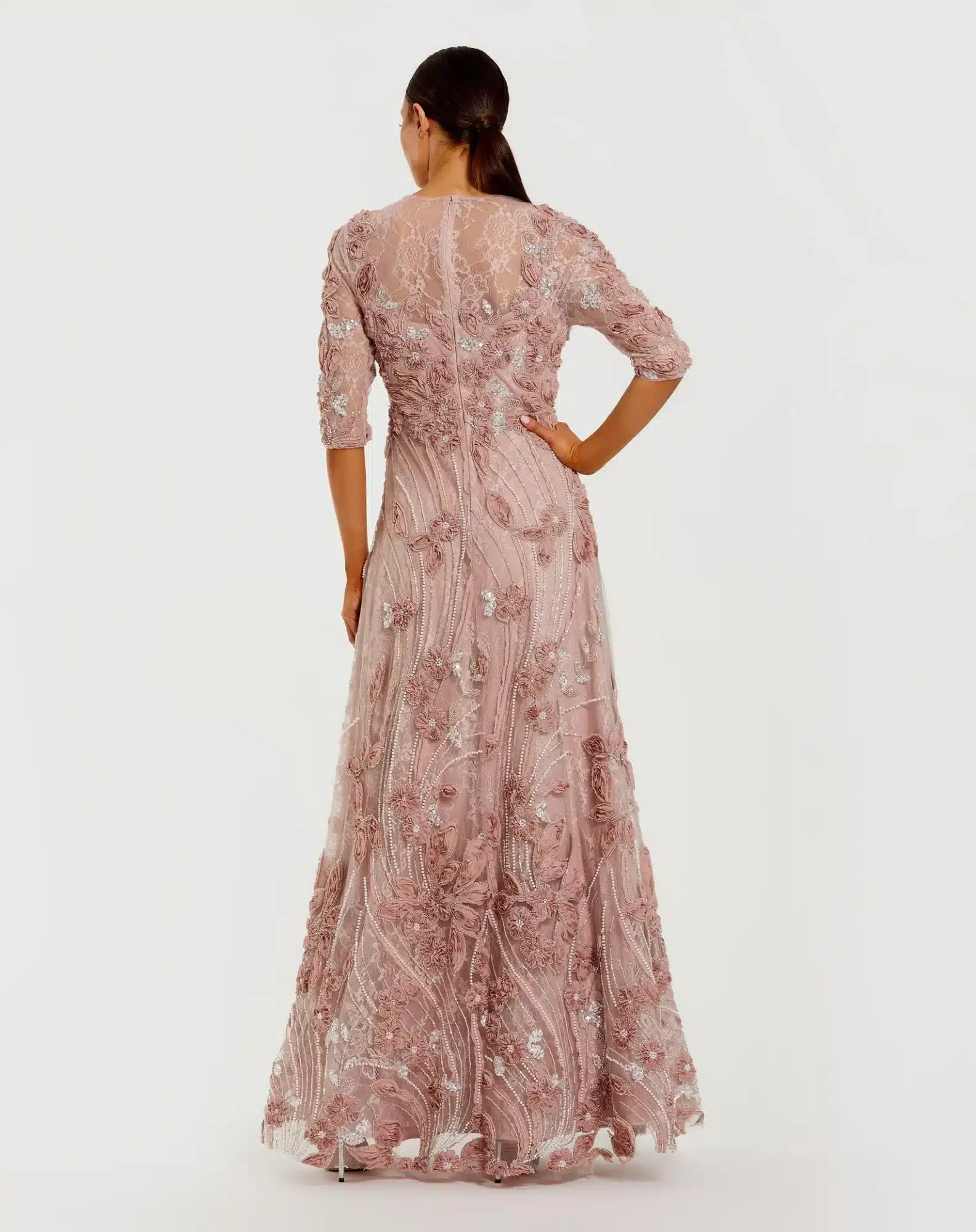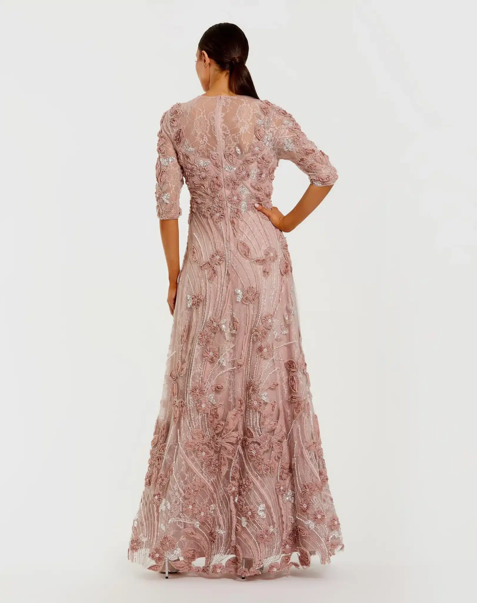 Adorned with 3D rosettes, beading, and pearls, this evening gown exudes glamour and sophistication. Featuring a high illusion neckline, sheer 3/4 sleeves, and a flattering a-line silhouette, it's perfect for making an entrance at any formal occasion.