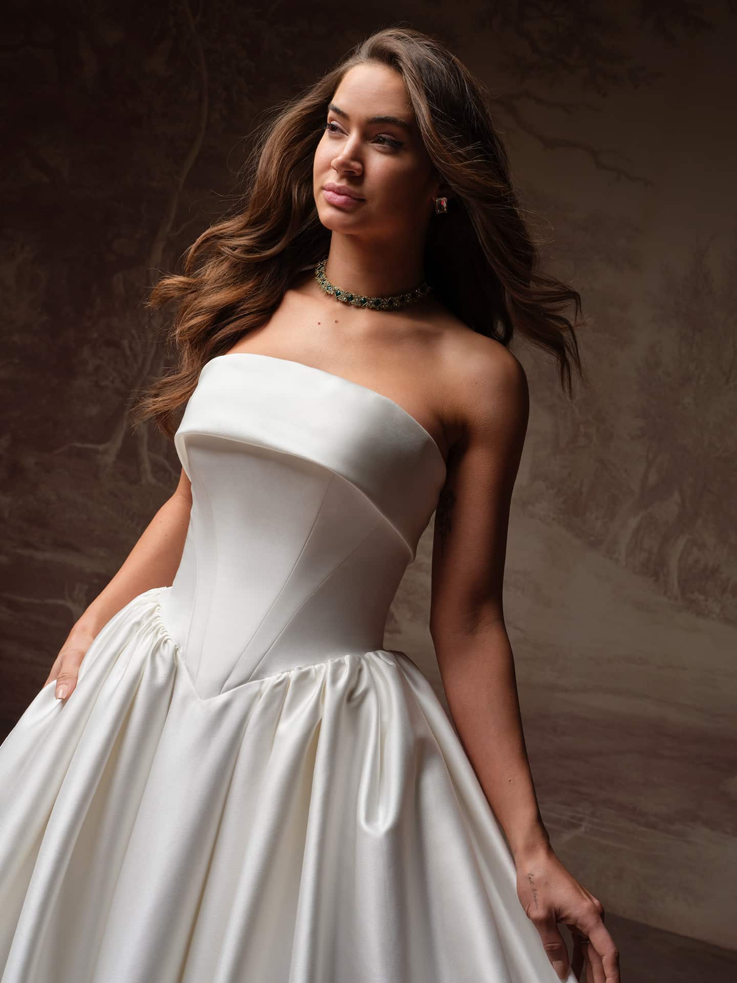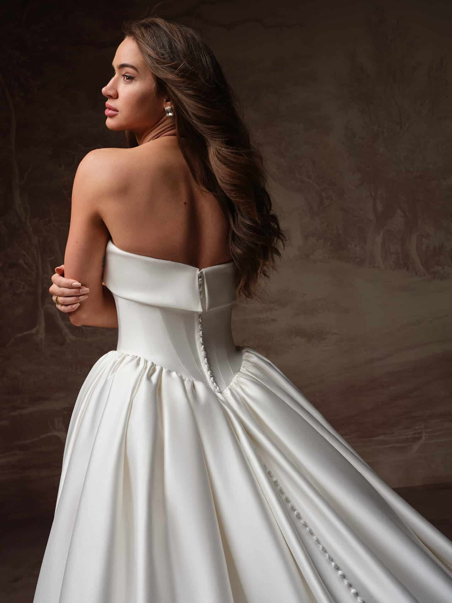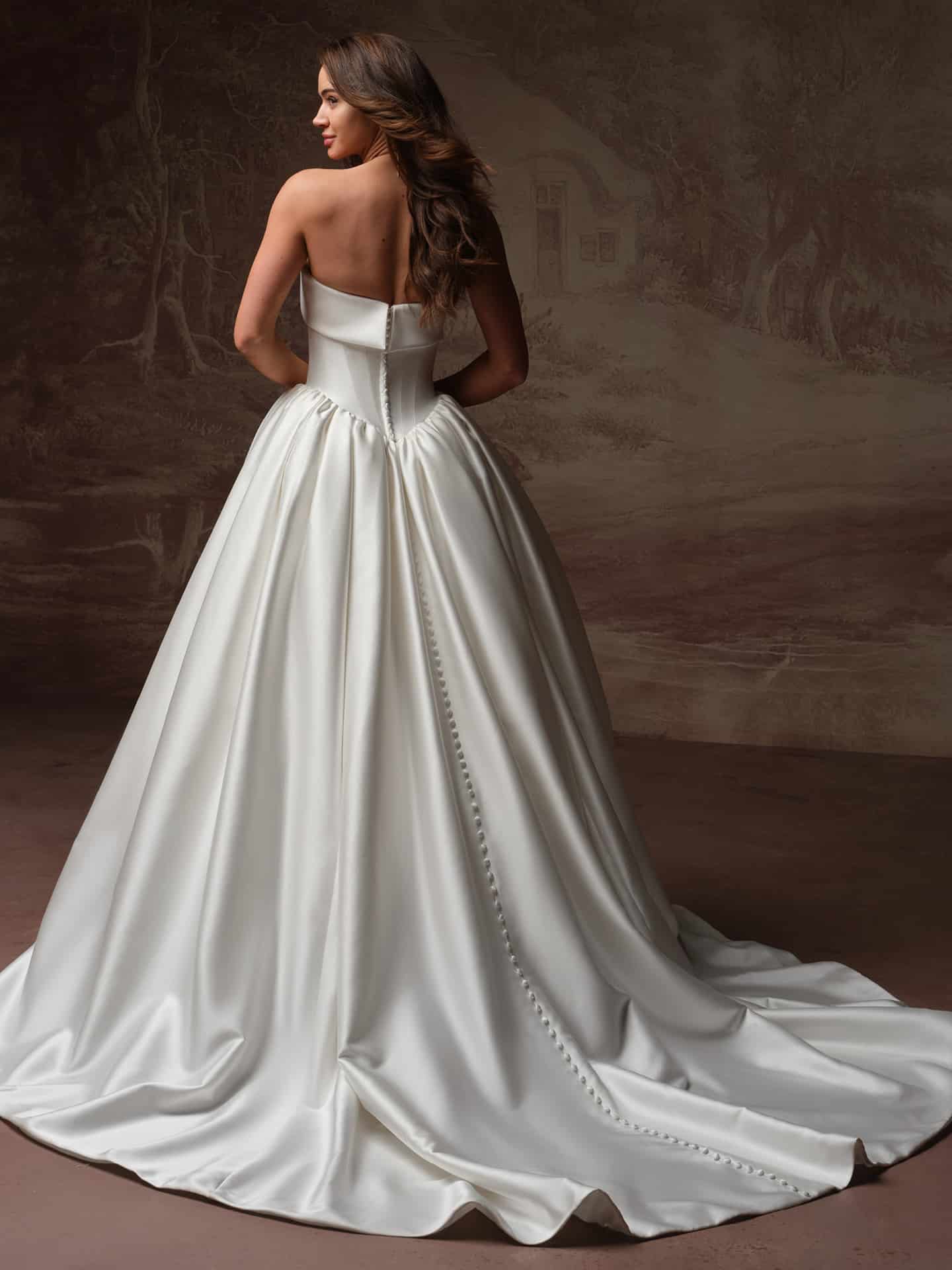 Rane by Maggie Sottero is a classic satin ball gown crafted from luxe Cartago satin for a clean, structured silhouette. The strapless banded neckline and sculpted basque waist create a flattering, timeless shape, while the full skirt adds effortless drama. Finished with an inner corset, zipper closure, and covered buttons trailing to the hem, Rane embodies modern minimalism with a refined bridal edge.