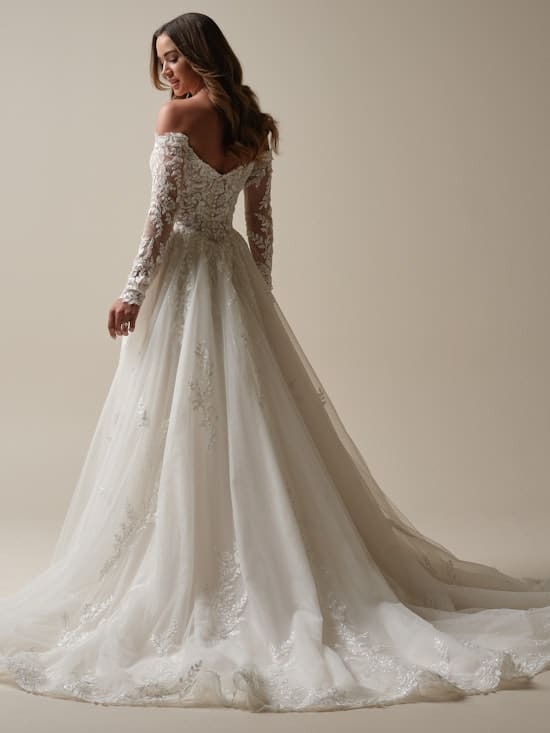 An effortless, irresistible, and perfectly tailored off-the-shoulder beaded A-line bridal gown made for sunshine, chandeliers, moonlight, candlelight - all the magical light.