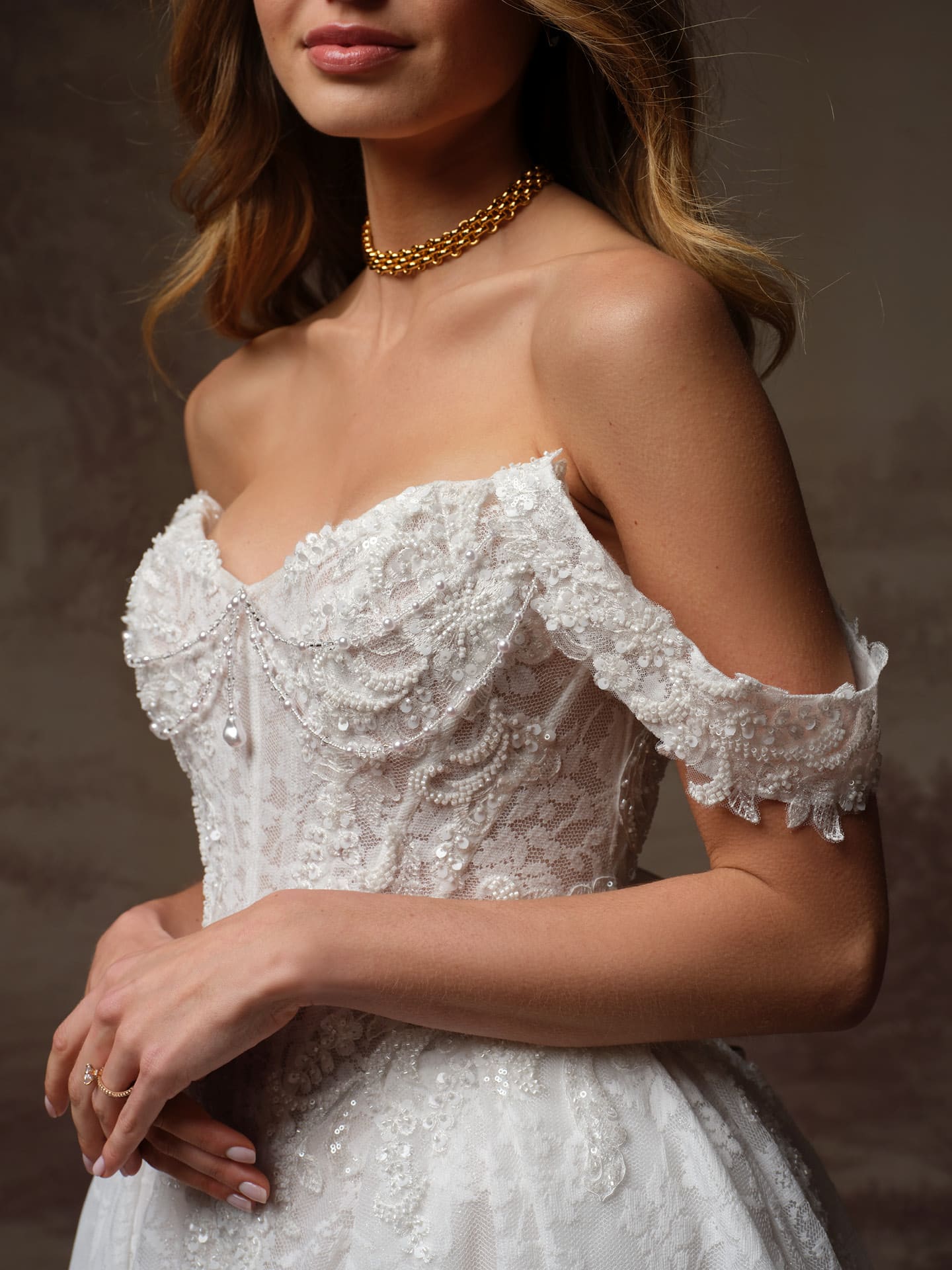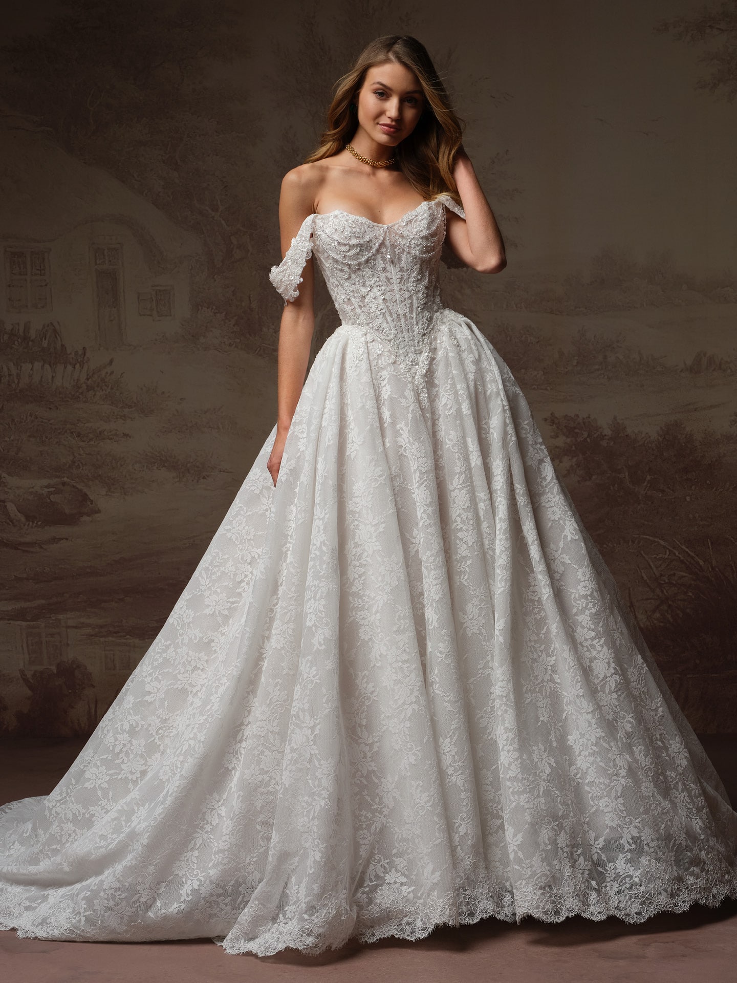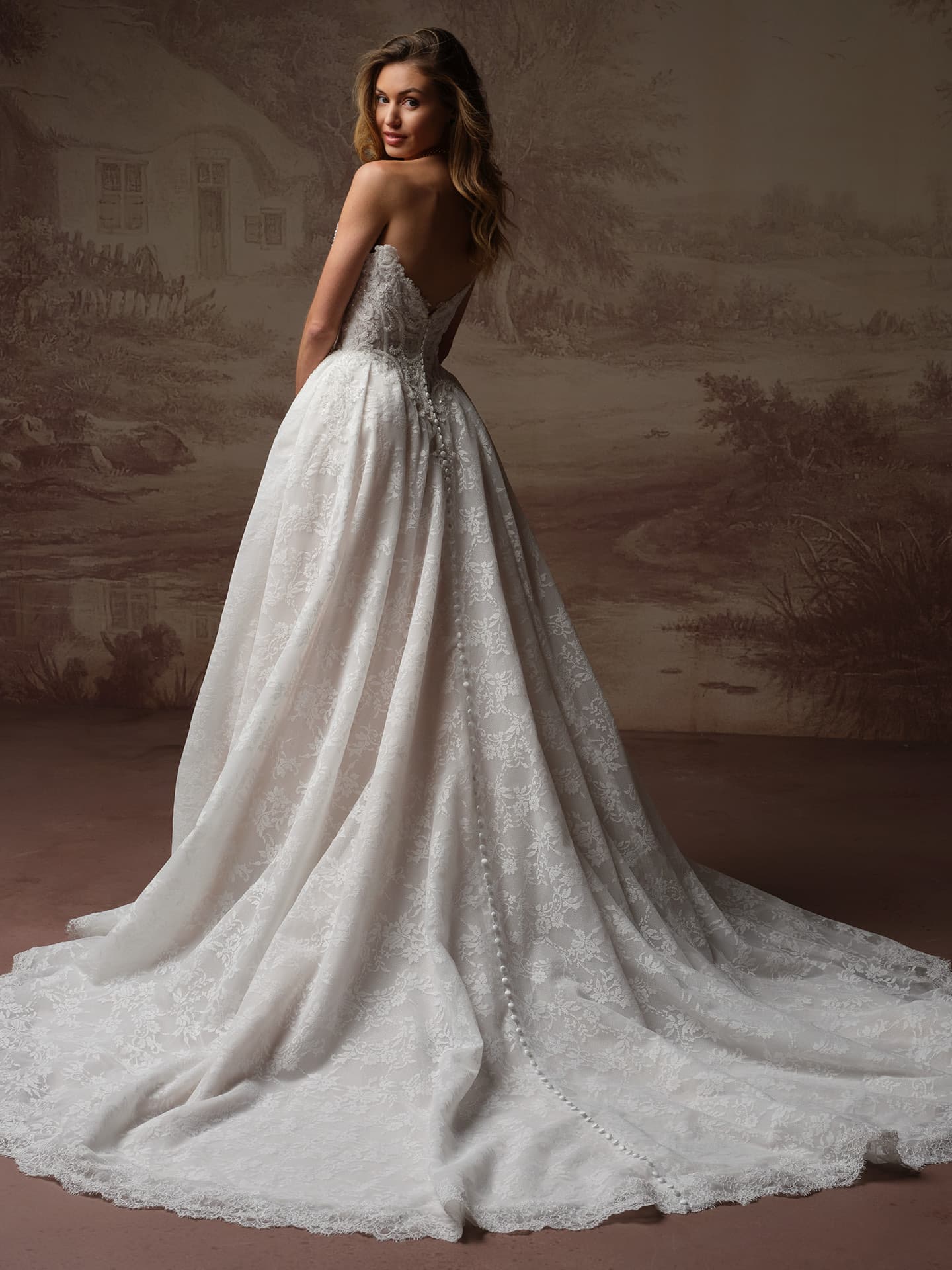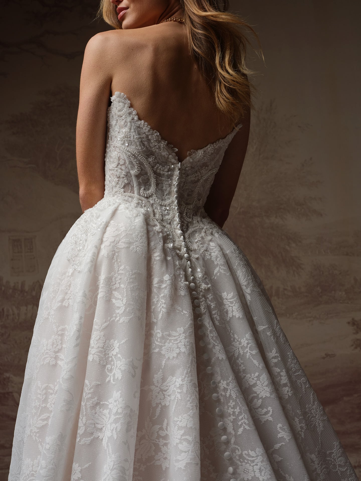 Ryland by Maggie Sottero is a romantic Chantilly lace gown layered over sparkle tulle for a soft, luminous finish. The illusion bodice features beaded and sequined motifs with exposed boning and a flattering basque waist, while the strapless cat-eye neckline is adorned with delicate draped pearl detail. Finished with a V-back, hidden pockets, and covered buttons trailing to the hem, Ryland blends timeless elegance with modern charm.