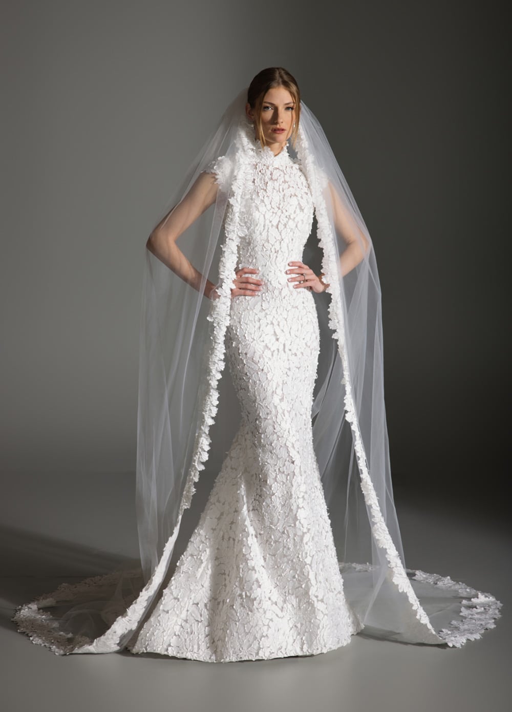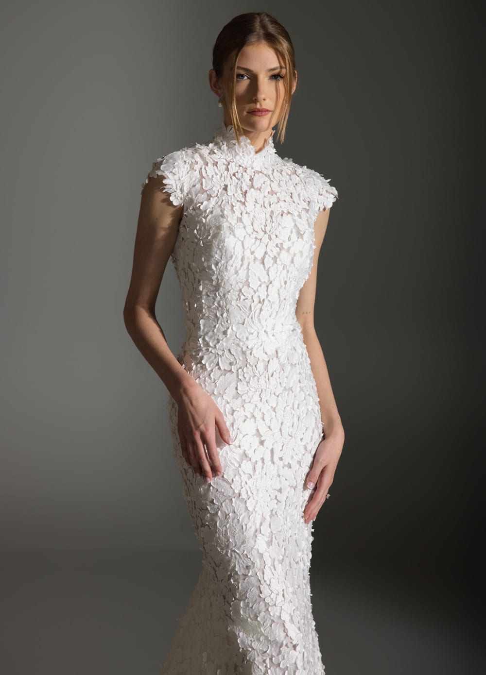 This fitted gown features a high neckline and cap sleeves, the laser cut floral design creates a rich texture throughout the silhouette. Sculpted through the bodice and hips, the design flows into a softly flared skirt with a subtle train. An open back adds contrast to the refined front, while the matching sheer veil, edged with coordinating floral appliqués, completes the look with a seamless, couture finish.