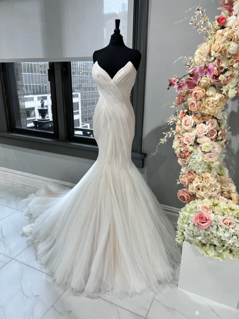 This wedding gown is a vision of elegance, crafted from soft white Italian illusion fabric and expertly hand-draped to create a flattering mermaid silhouette with a built-in corset. The gown features a sweet sweetheart neckline and off-the-shoulder sleeves, adding a touch of romantic allure to the sophisticated design.
