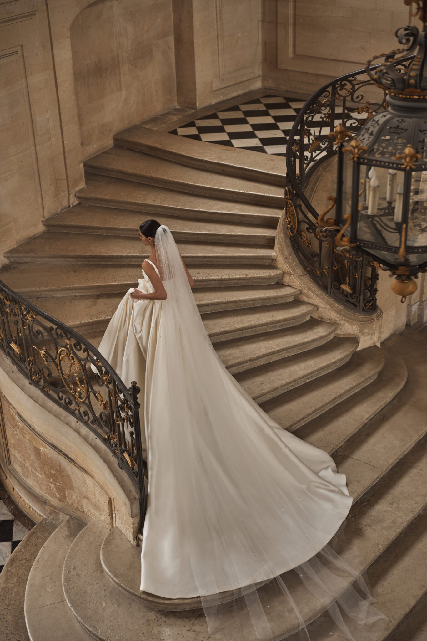 Refined A-line wedding gown crafted from mikado. This classic design features a corset with a cinched waist, a draped heart-shaped neckline framed by wide straps, a zipper closure on the back, and a lush full skirt with a long train. The dress features a delicate scattering of pearls adorning the neckline, straps, and upper portion of the skirt.