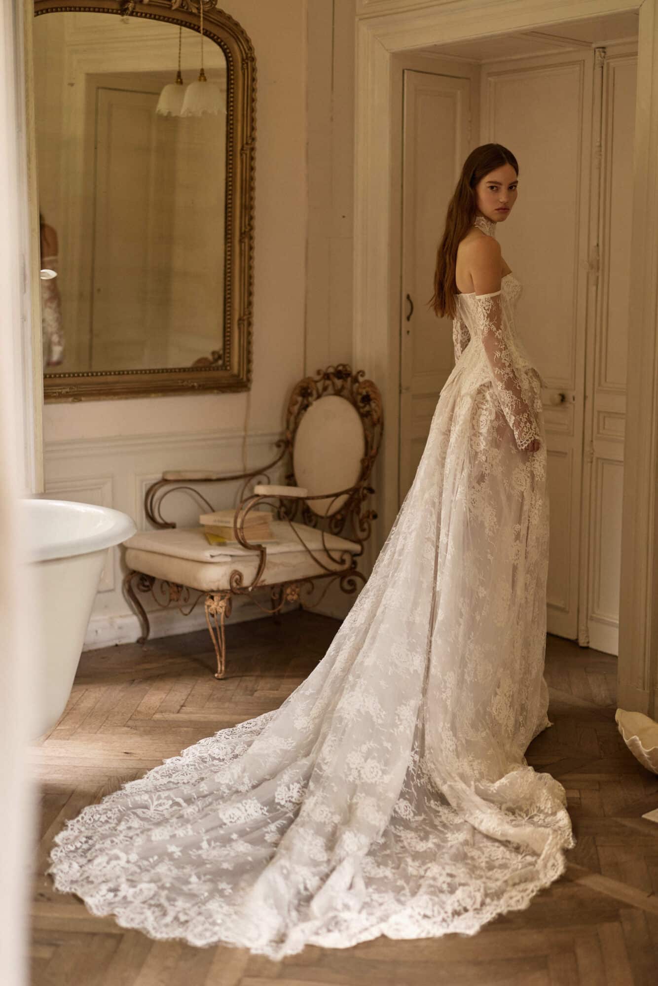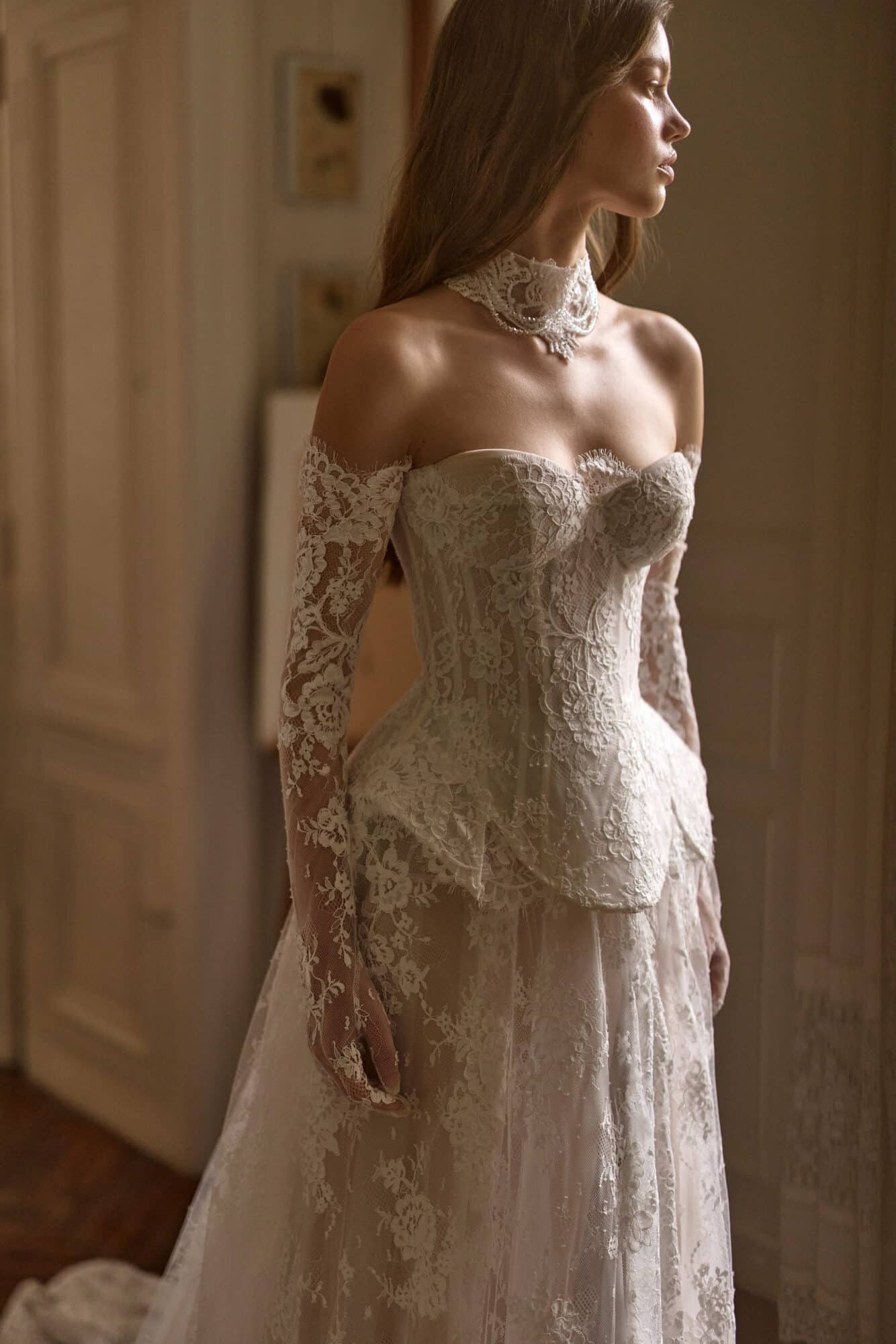 Averic is a romantic, couture lace look with a sensual, vintage-inspired edge. The structured corset bodice features delicate floral lace, a sweetheart neckline, and elegant off-the-shoulder lace sleeves, sculpting the waist with a refined, corsetry fit. A matching lace choker adds a dramatic, old-world finish. The sheer lace skirt flows effortlessly to the floor, revealing subtle movement and texture with a soft train that trails behind. Timeless yet daring, Averic is designed for the bride who loves heirloom lace with modern allure.
