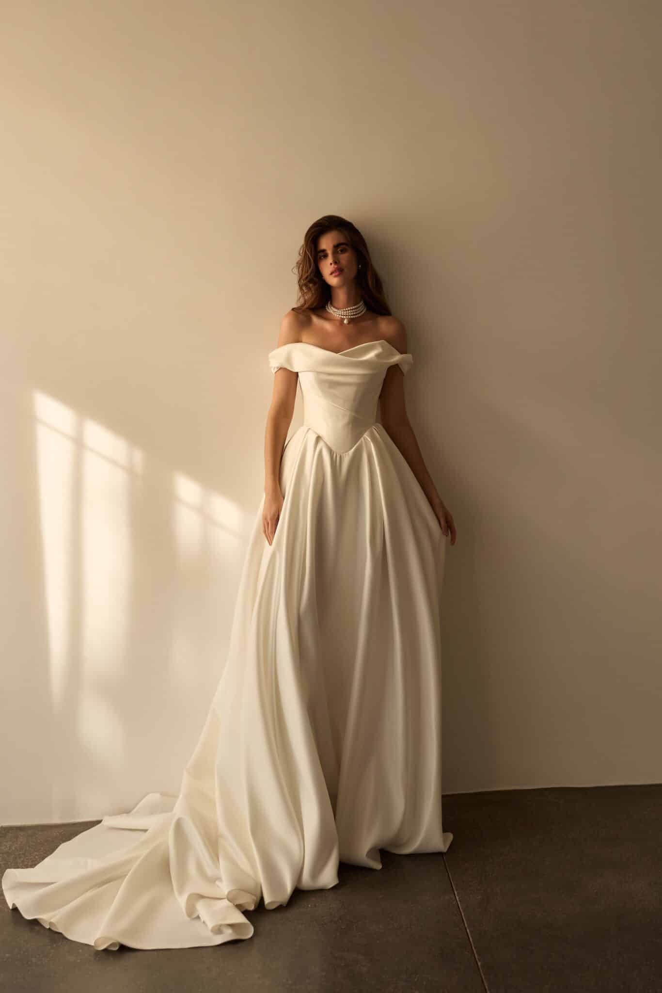 This gown exudes effortless romance with its softly draped off-the-shoulder neckline and sculpted corset bodice that defines the waist beautifully. The flowing skirt falls with graceful movement, creating a timeless silhouette that feels both light and refined. Paired with a delicate lace veil, this design is perfect for the bride seeking classic elegance with a soft, ethereal finish.