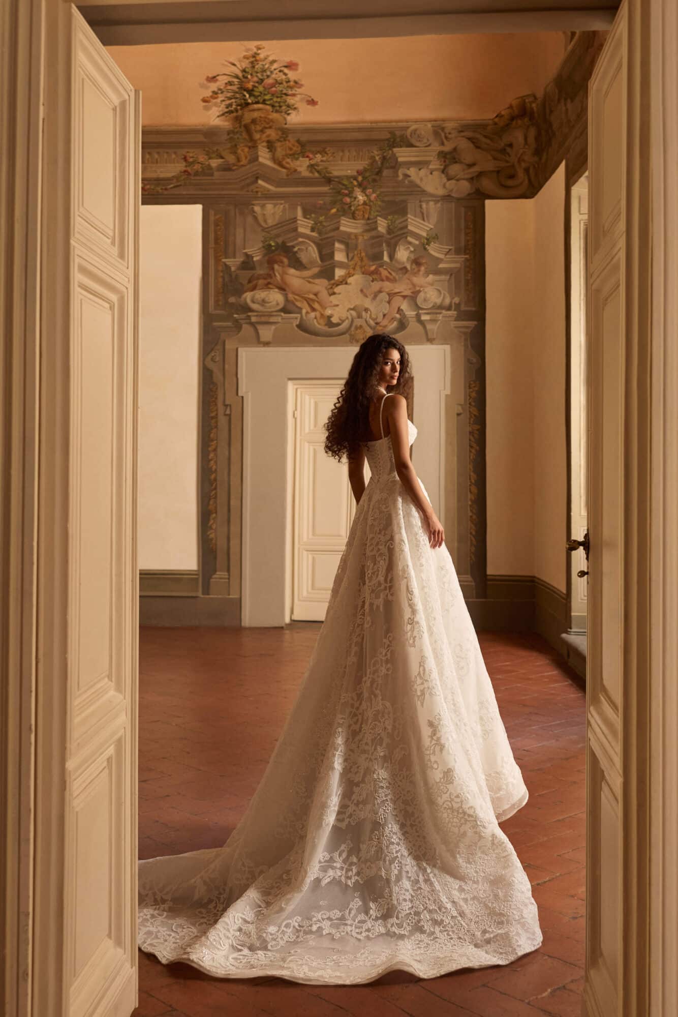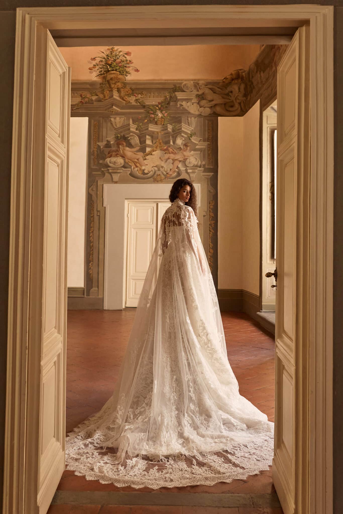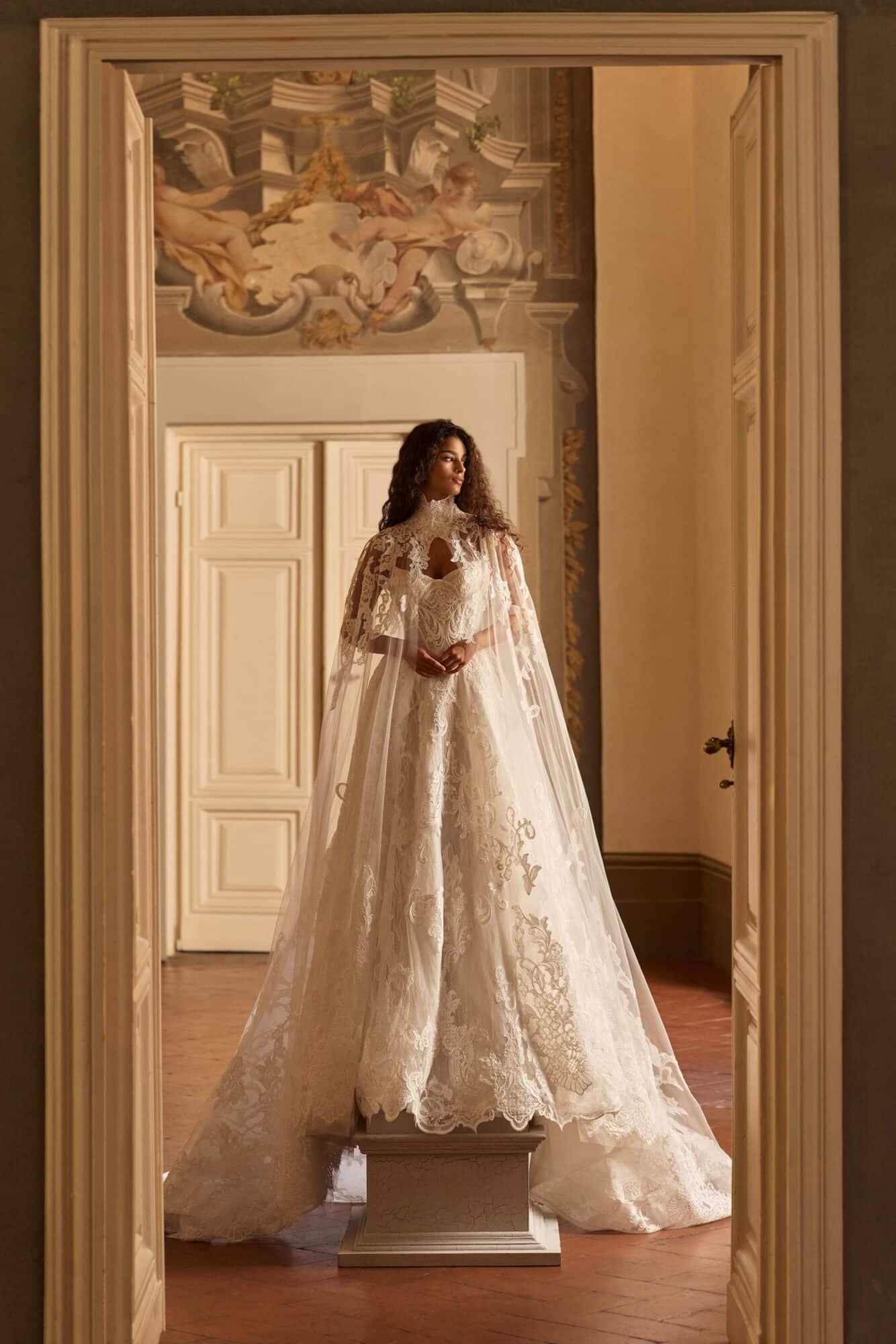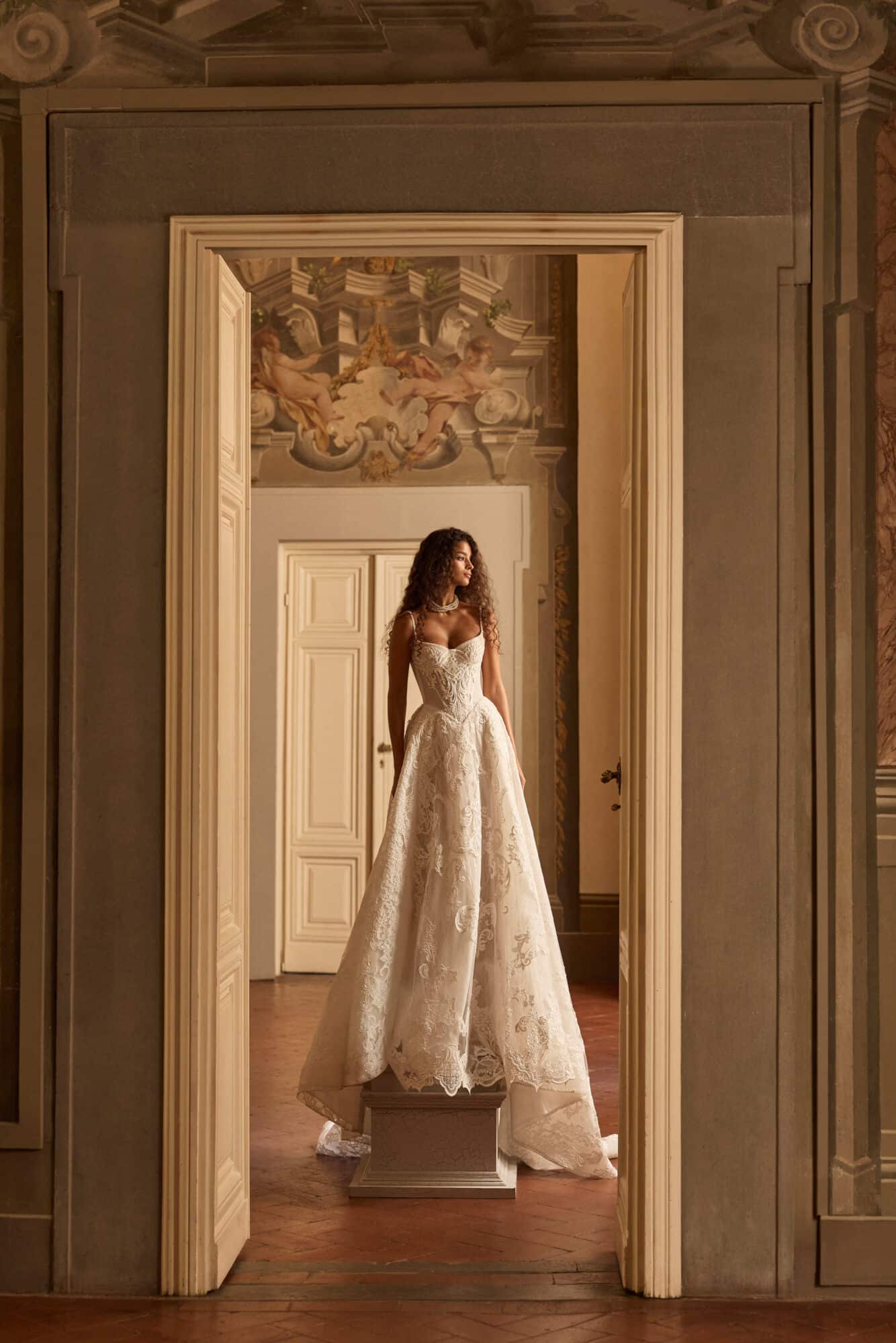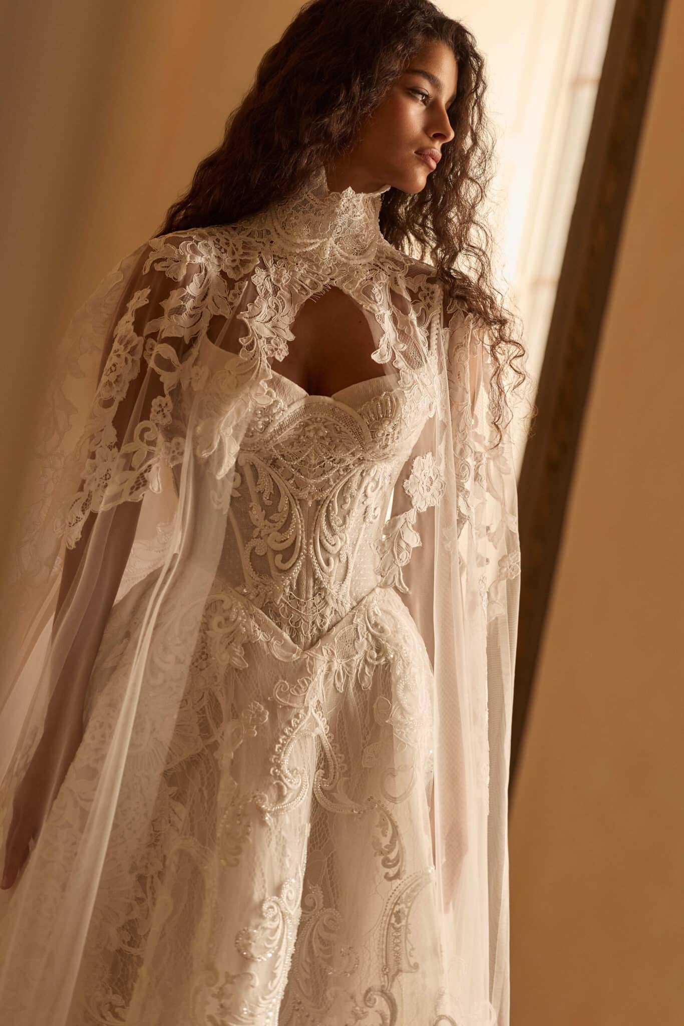 Lysandra by Milla Nova is a regal ball gown that captures the essence of timeless romance with a modern couture edge. The structured corset bodice features intricate embroidery and delicate beading, sculpting the figure with a flattering, feminine shape and a soft sweetheart neckline. Flowing into a voluminous skirt, the gown is adorned with ornate lace appliqué that creates movement and dimension with every step. Fine straps add a hint of delicacy, while the optional sheer lace cape introduces a dramatic, ethereal finish. Perfect for the bride seeking a statement-making silhouette with graceful, old-world elegance.