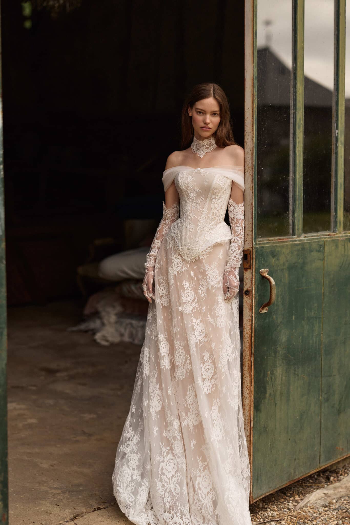 This gown exudes vintage-inspired romance, featuring a corset-style lace bodice with an elegant off-the-shoulder neckline and softly sculpted waist. Delicate floral lace flows effortlessly through the sheer skirt, creating a light, ethereal silhouette with graceful movement. Finished with matching lace gloves and a refined choker detail, this look feels timeless, feminine, and beautifully undone.