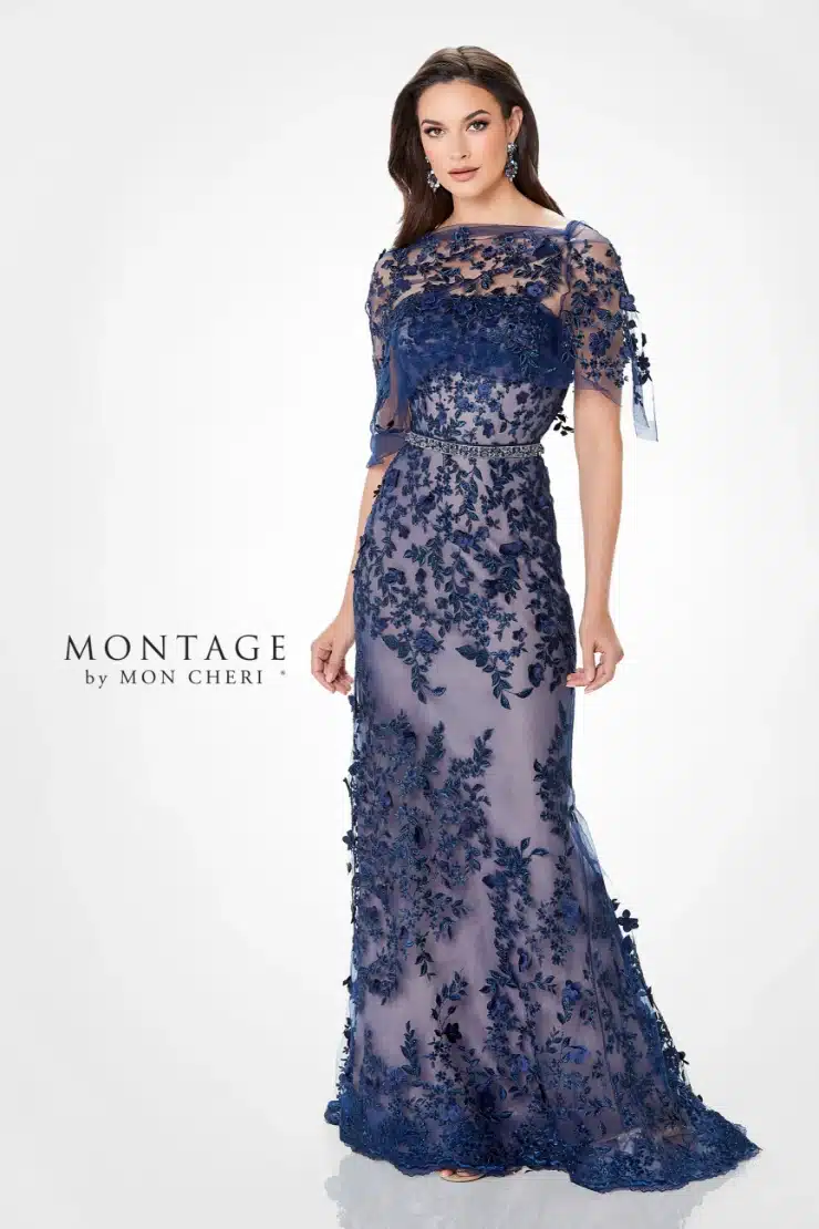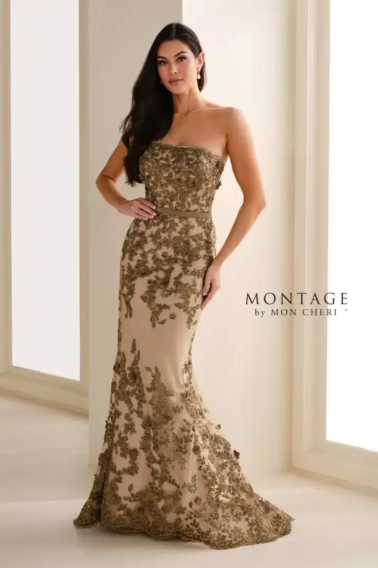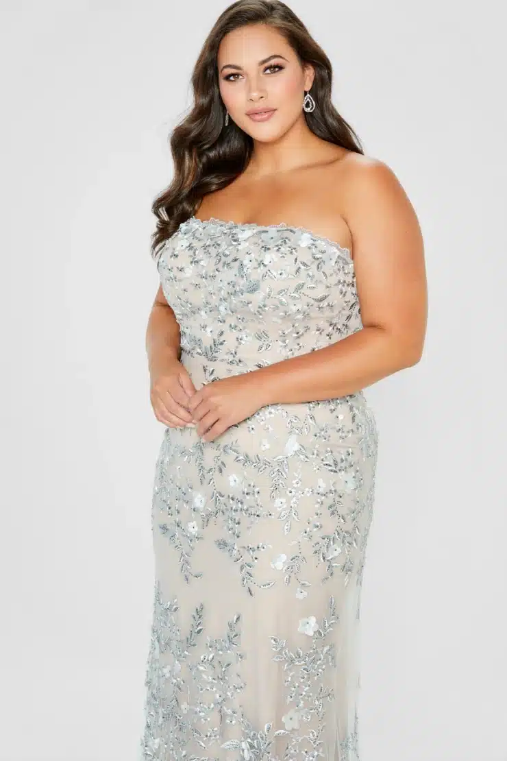 Meticulously detailed, this multiple piece strapless tulle and metallic embroidered lace fit and flare gown is adorned with three-dimensional flowers and heat set stones. It also features a scalloped neckline, a natural waistline that can be accented with a removable beaded waistband or a satin belt, a scalloped lace hem, and a sweep train. A matching tulle shrug with lace and removable straps are included.