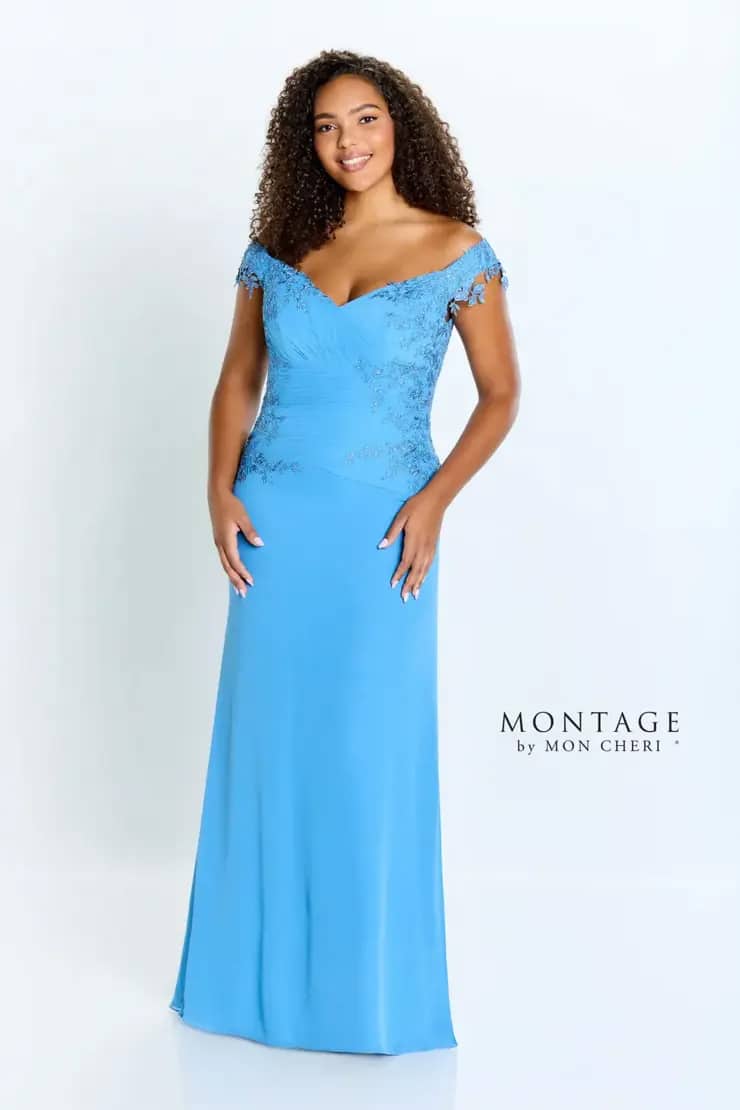 Chiffon fit and flare gown featuring lace apppliques on a draped bodice with a v-neckline and off-the-shoulder sleeves. Shawl included
