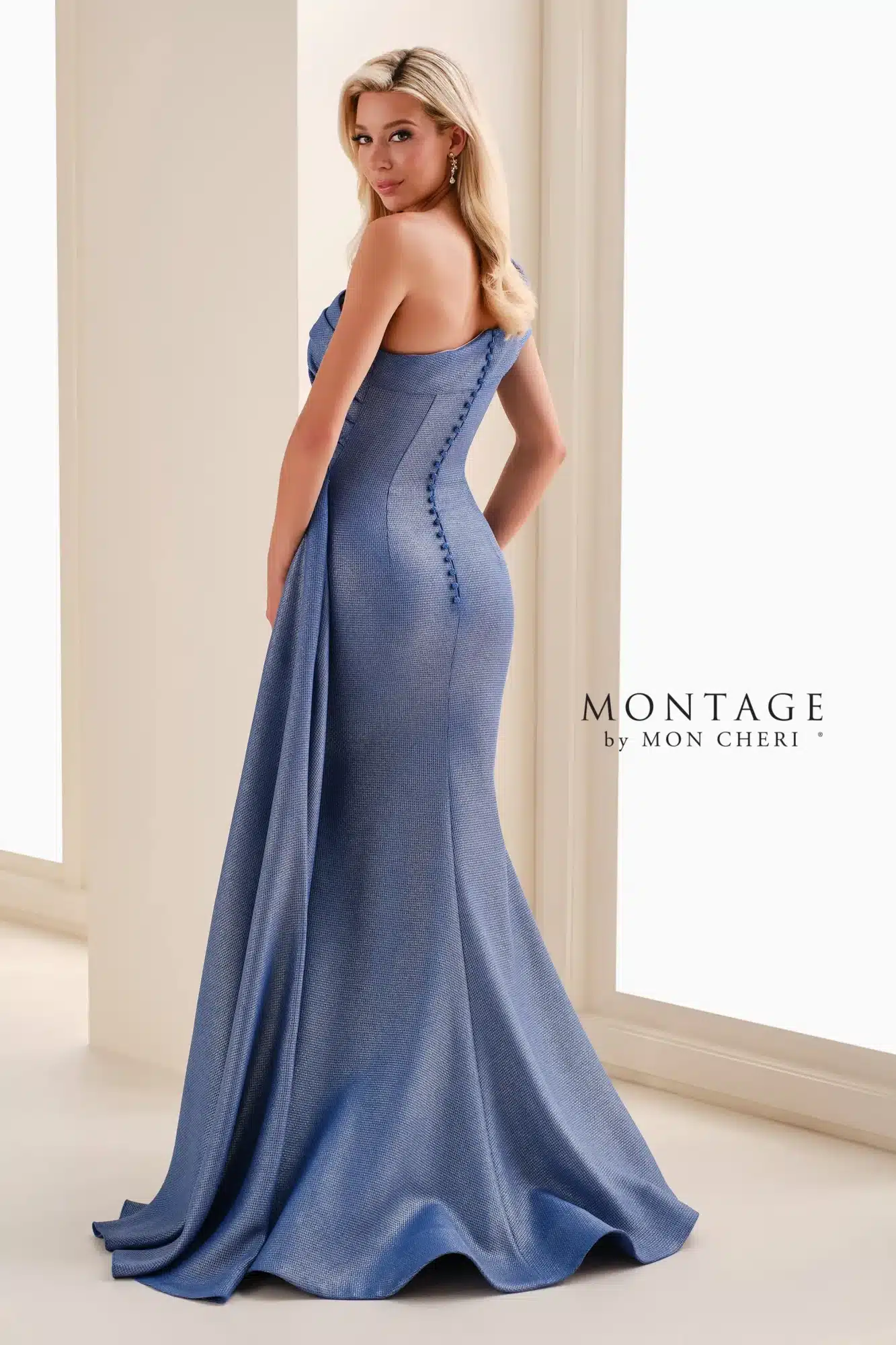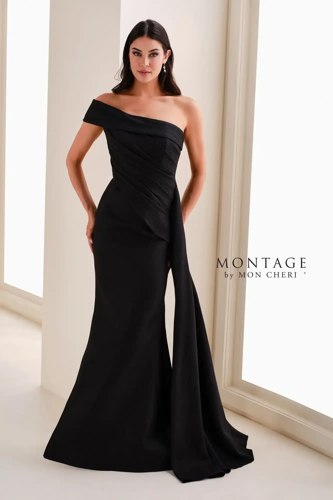 An elegant one-shoulder gown featuring flattering asymmetrical pleating and a softly draped side cascade. Crafted from a textured stretch fabric for a smooth fit, this modern silhouette offers timeless sophistication for any special occasion.